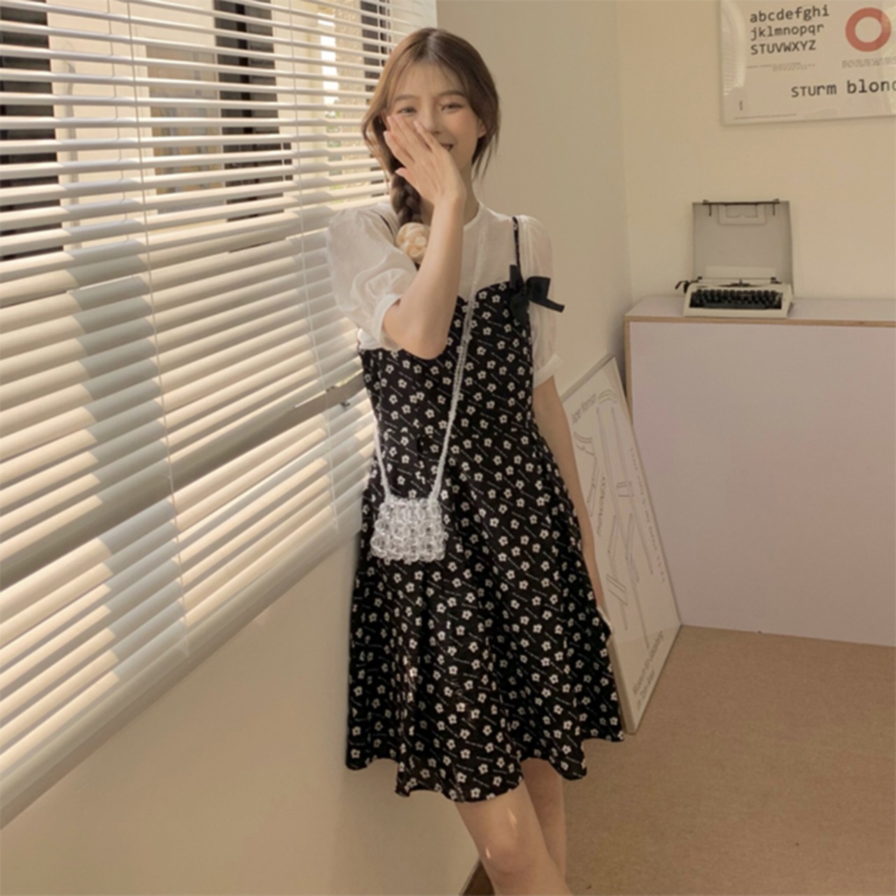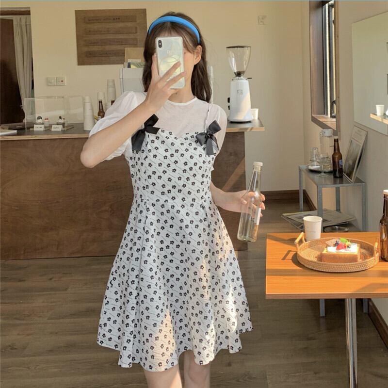 色:ホワイトトップ,ブラックサスペンダースカート,白いドレス,青い服