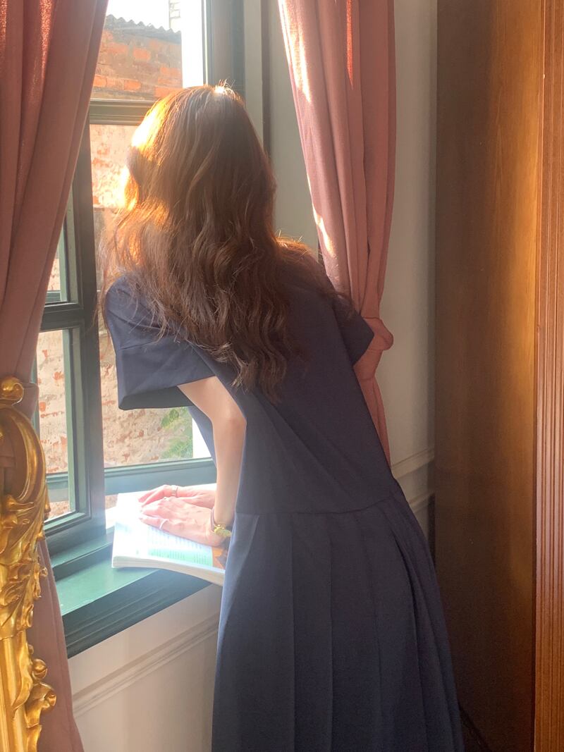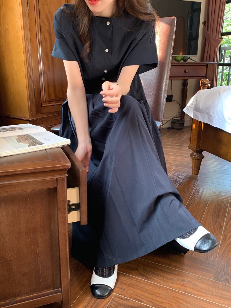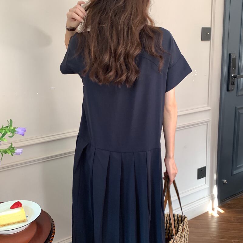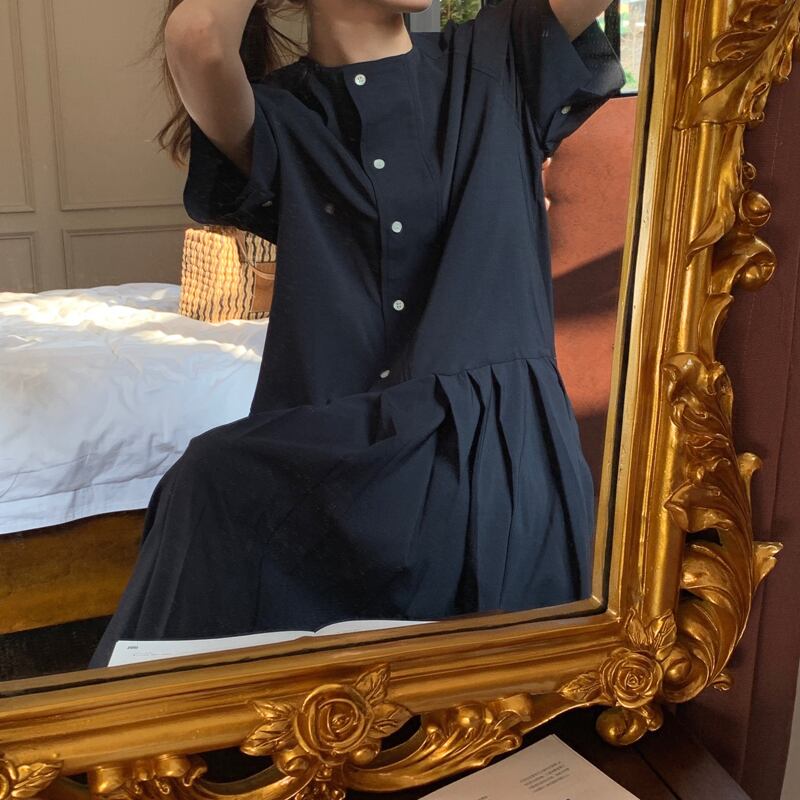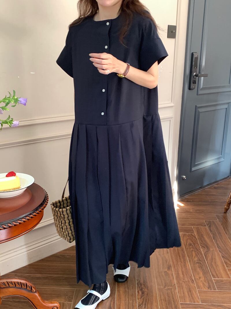 韓国ファッション夏服スタンダードソリッド カラーラウンドネックルーズロング半袖スリーブプリーツワンピースレディース ショート レトロ ハーフスリーブ 夏物 Oネック ソリッドカラー muzly71915434863 | Neatly