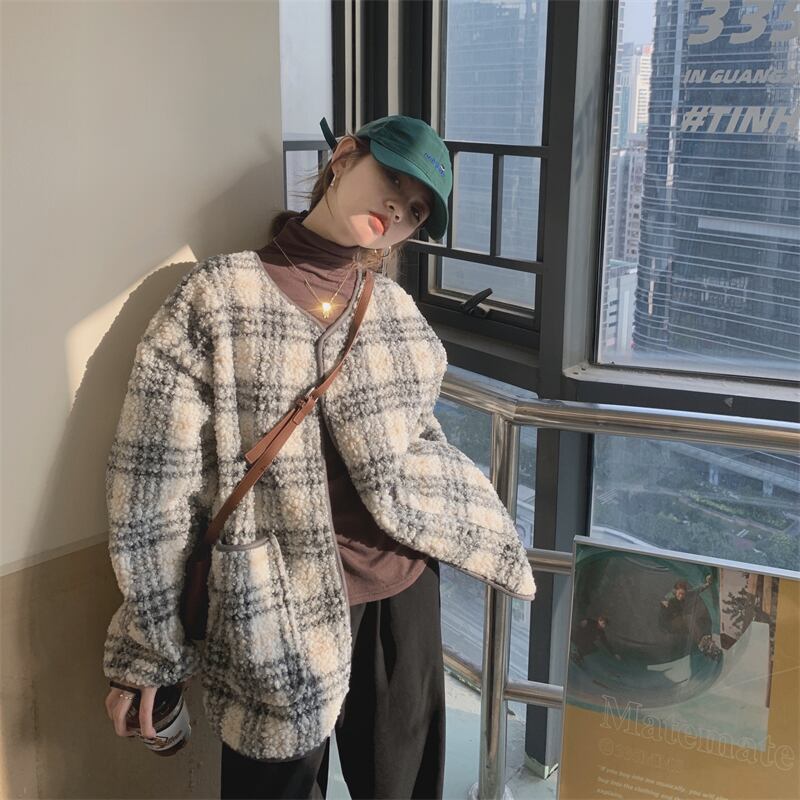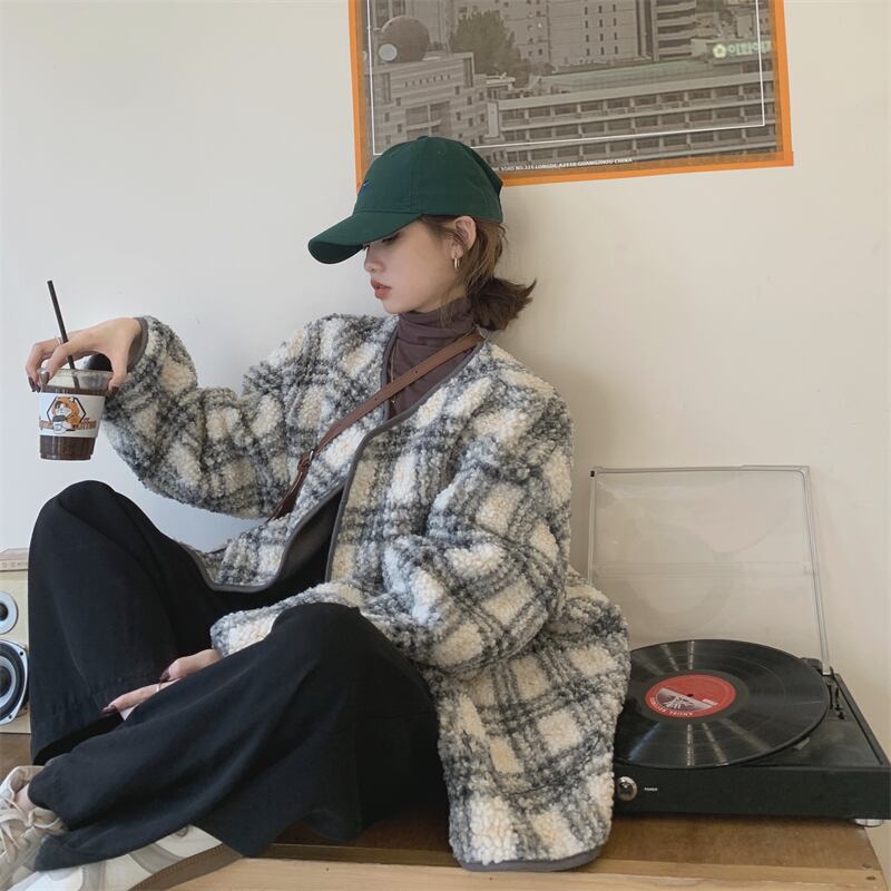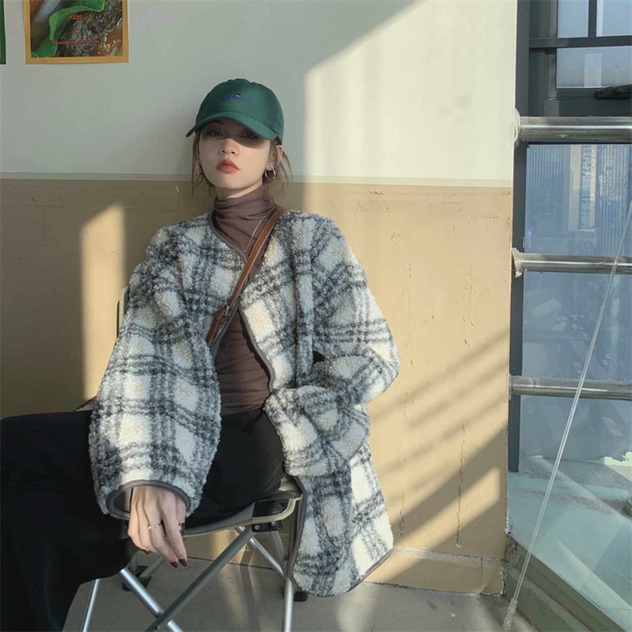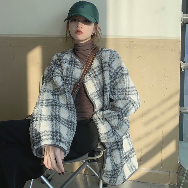 韓国ファッション秋物ウィンターウールコート スタンダードラウンドネック格子柄ルーズカーディガンレディース ロング コットン レトロ オータム 冬物 Oネック 長袖 muzly28270172883 | Neatly