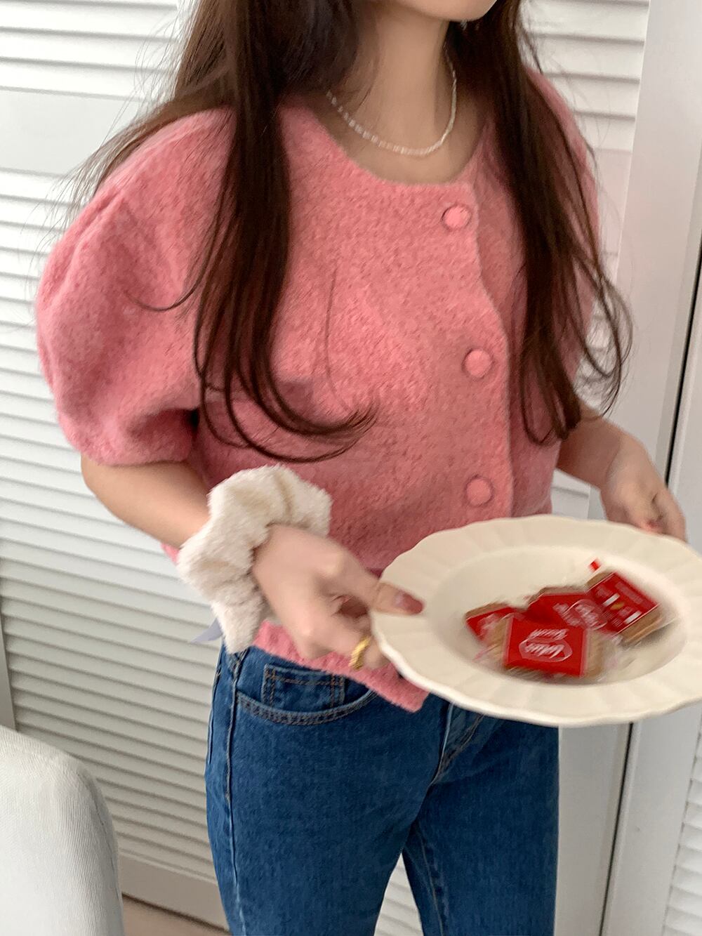 色:グリーンジャケット,ピンクトップ,白のシャツ,スカートS,スカートM