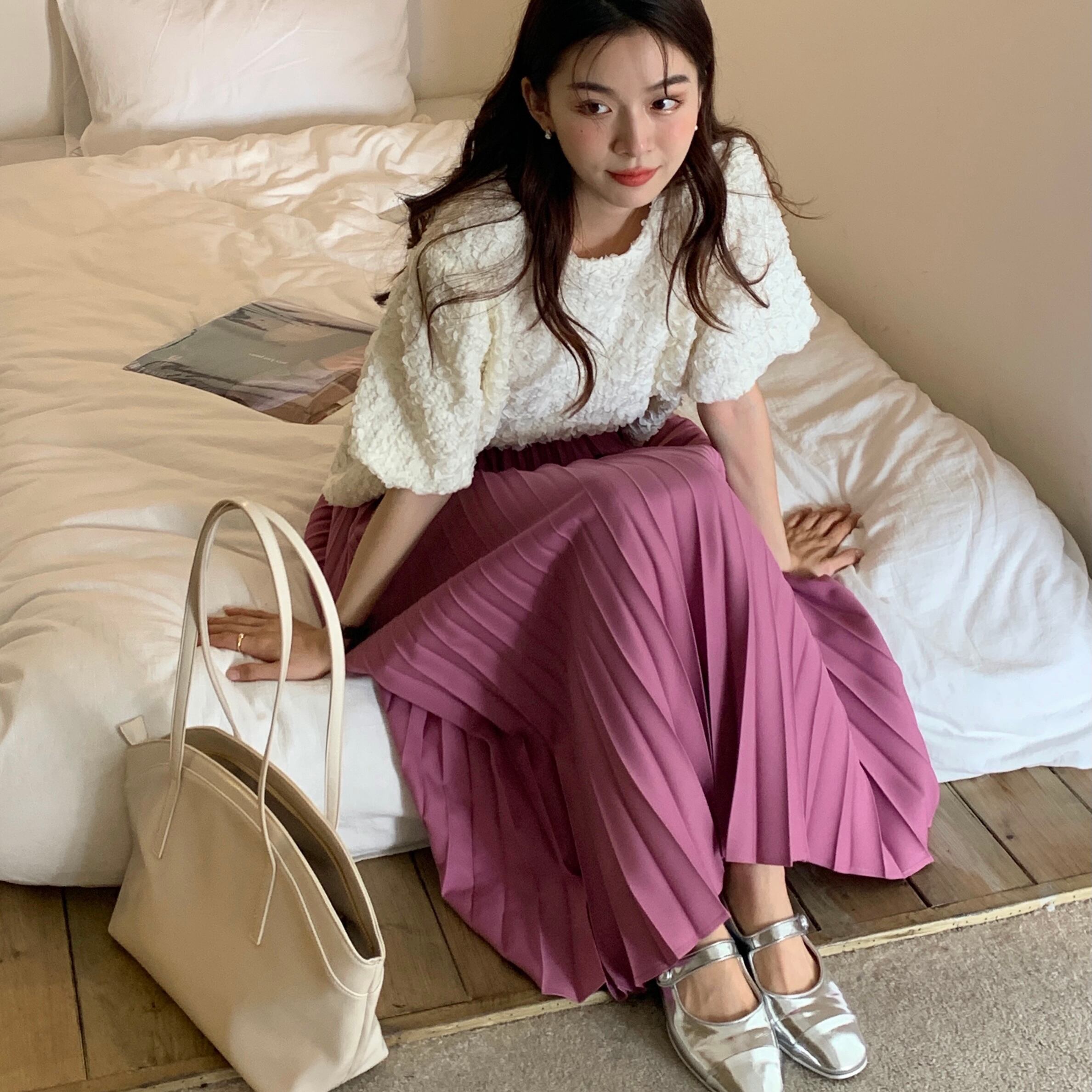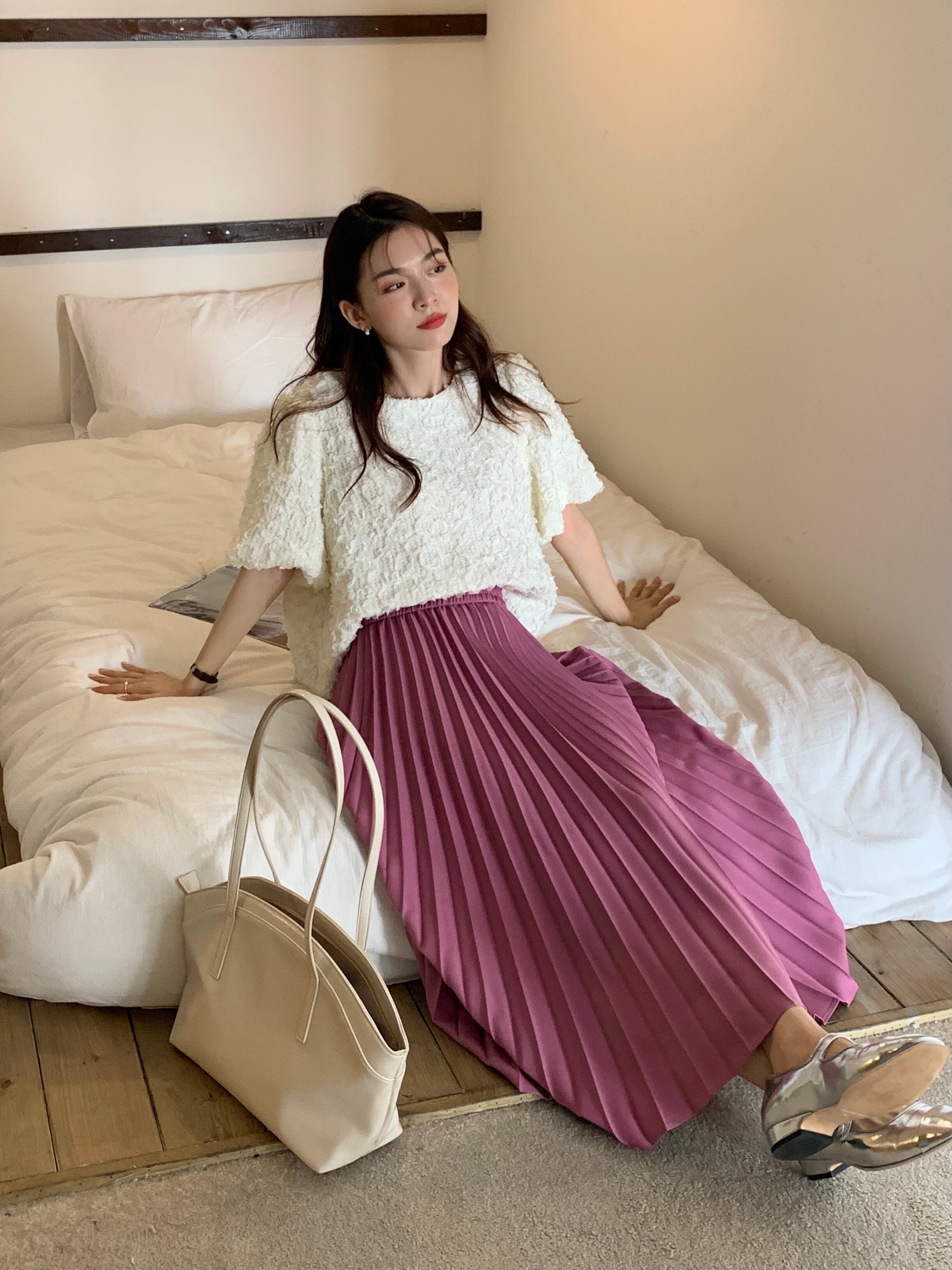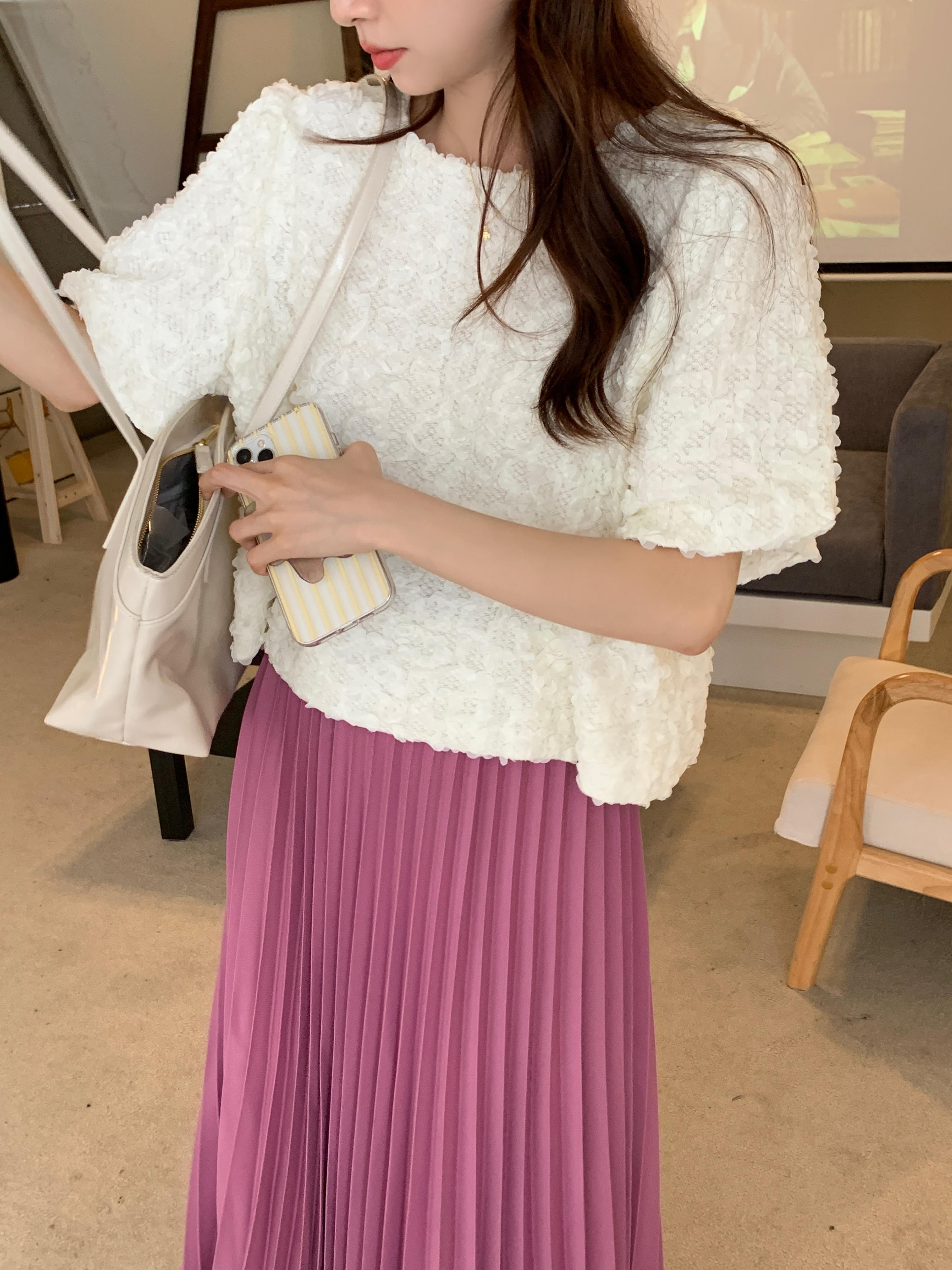 韓国ファッション夏服ラウンドネックFlowerデザイン シャツ ハイウェストウェストプリーツスカート 大人ガーリー スウィート キュート カジュアル 夏物 Oネック フラワーデザイン ウエスト muzly47694833789 | Neatly