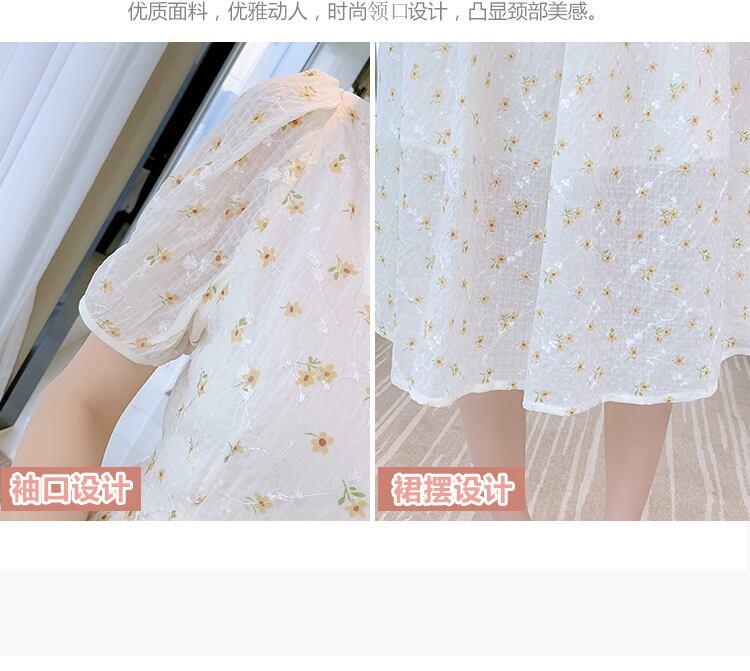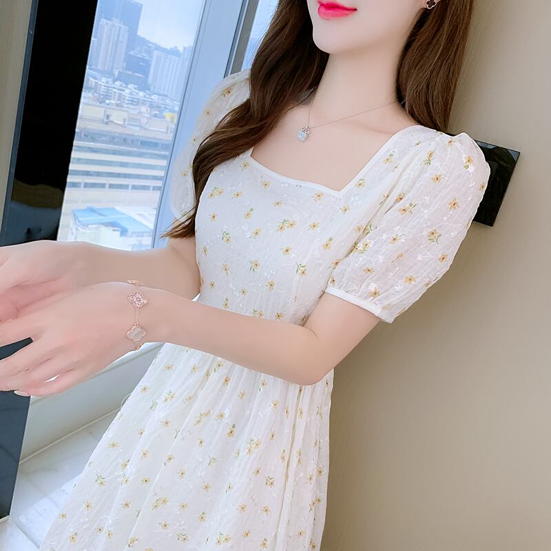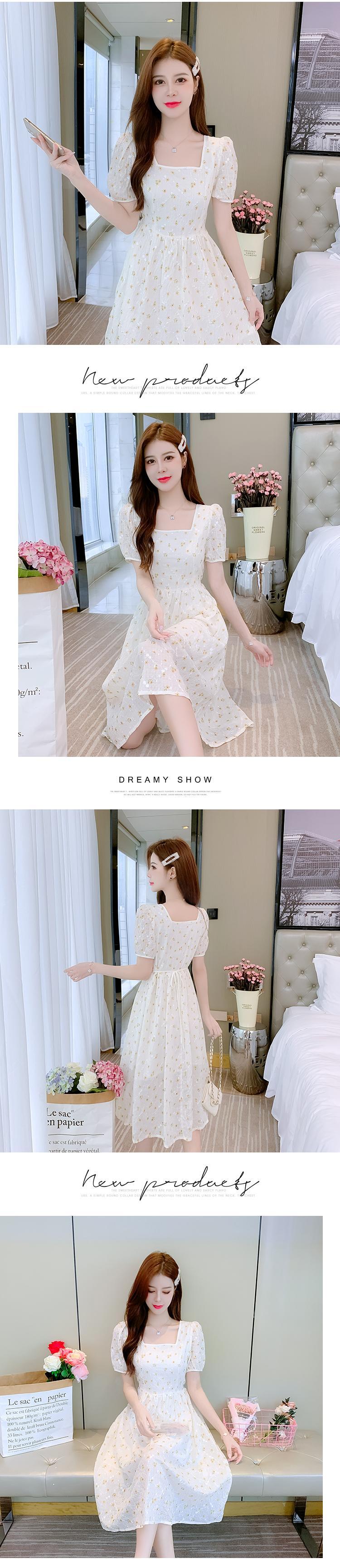 フローラルワンピース夏服ウェストスリーブスカート 大人ガーリー スウィート キュート カジュアル 夏物 花柄 スクウェア ウエスト ミドル丈 mengruling91971071304 | Neatly