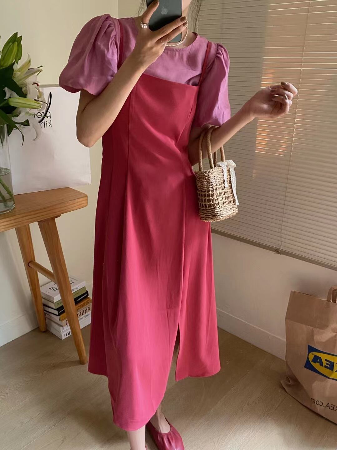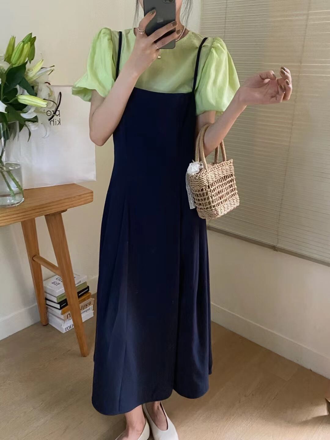 色:緑のシャツ,ブラックサスペンダースカート,ラズベリーシャツ,ラズベリーのスリップドレス