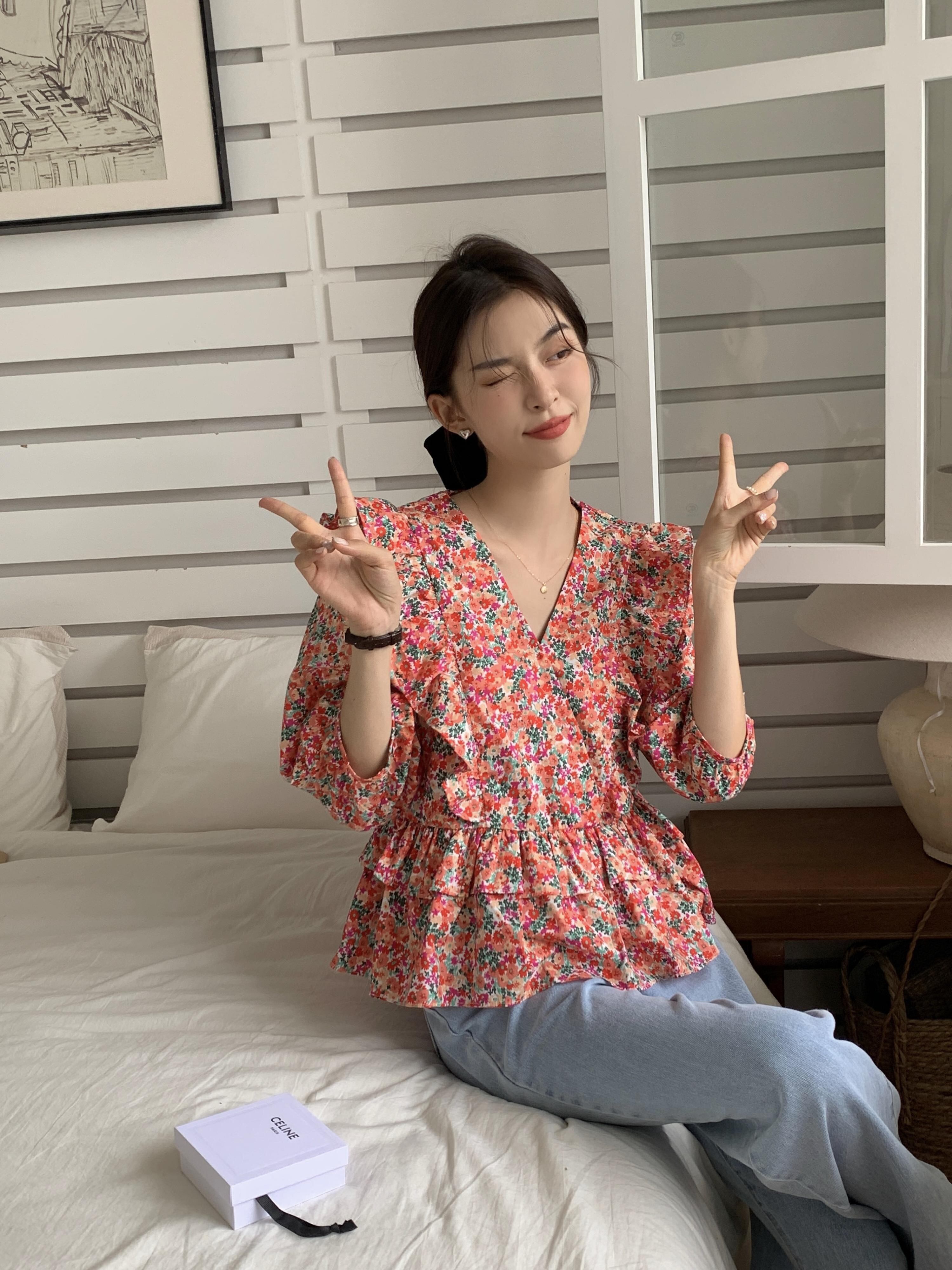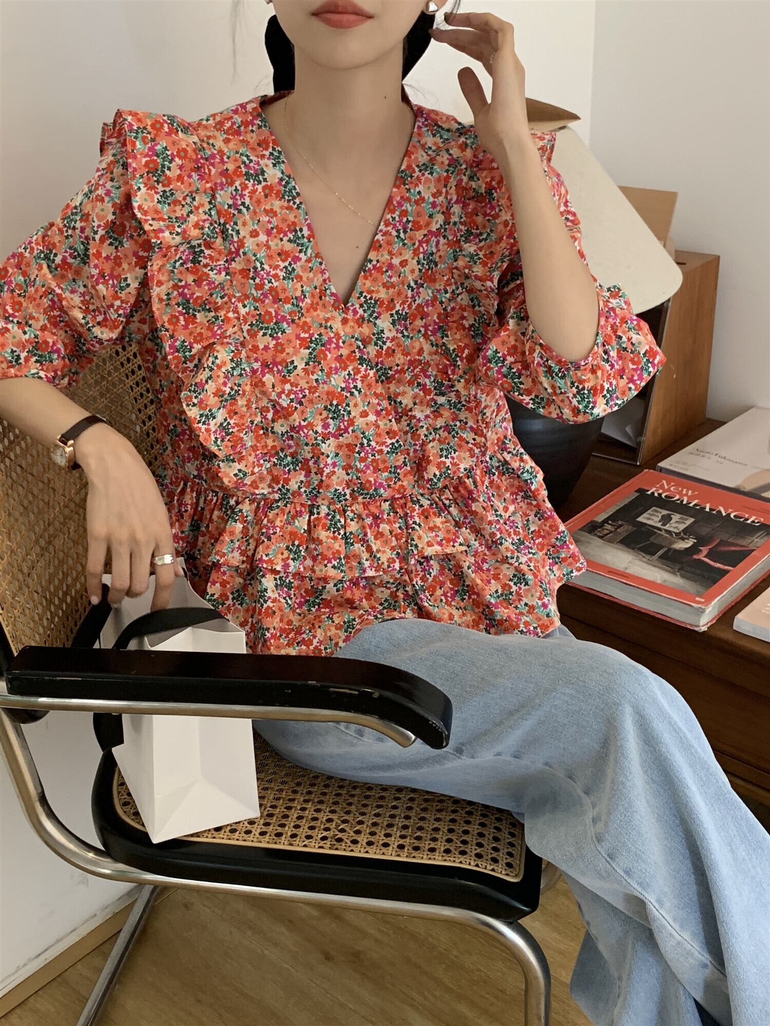 韓国ファッションNEW夏服Vネックショートシャツ ウェストフローラルレディース 大人ガーリー スウィート キュート カジュアル 夏物 花柄 ウエスト muzly26000540114 | Neatly