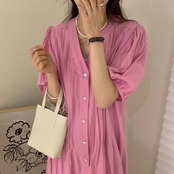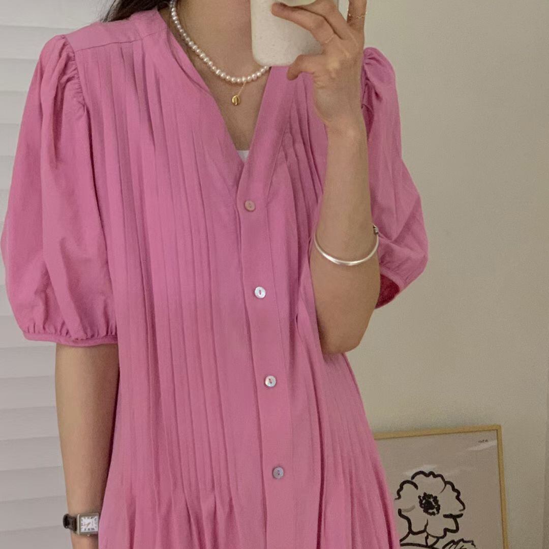 韓国ファッションNEW夏服Vネックプリーツロングルーズ薄手スリーブワンピースレディース 大人ガーリー スウィート キュート カジュアル エレガント 夏物 muzly35529658080 | Neatly