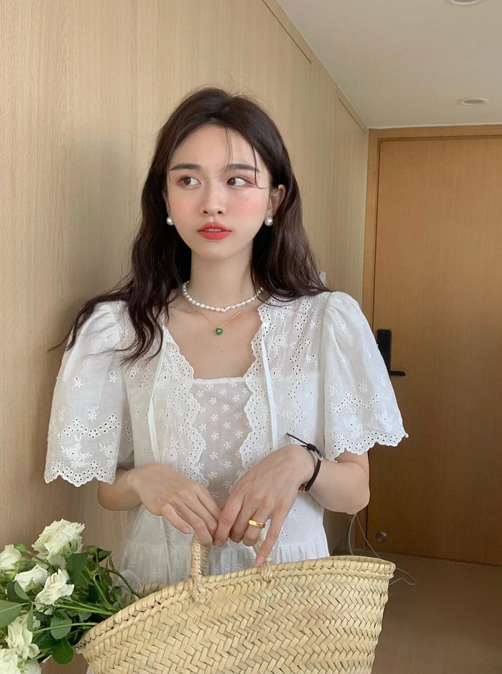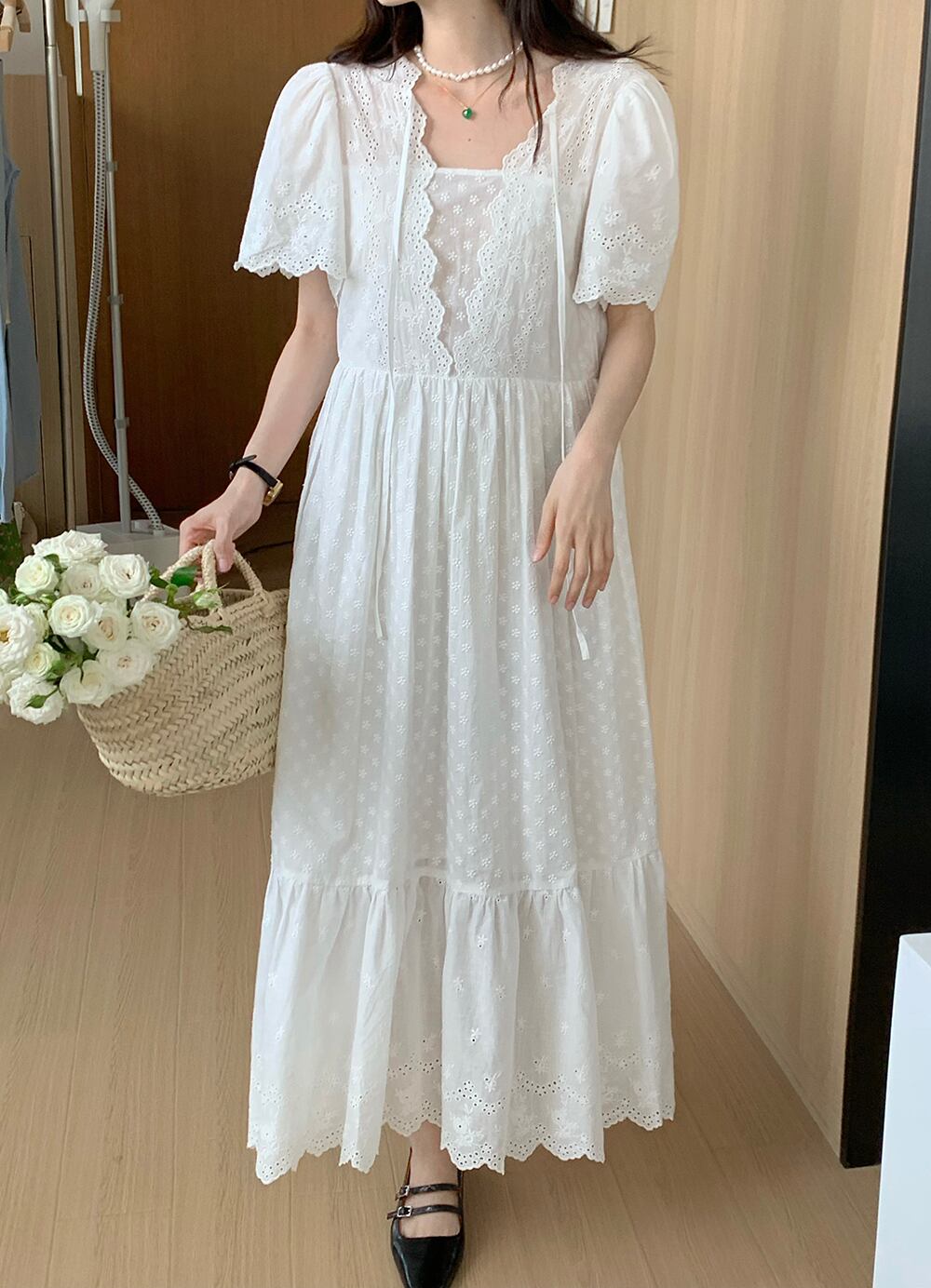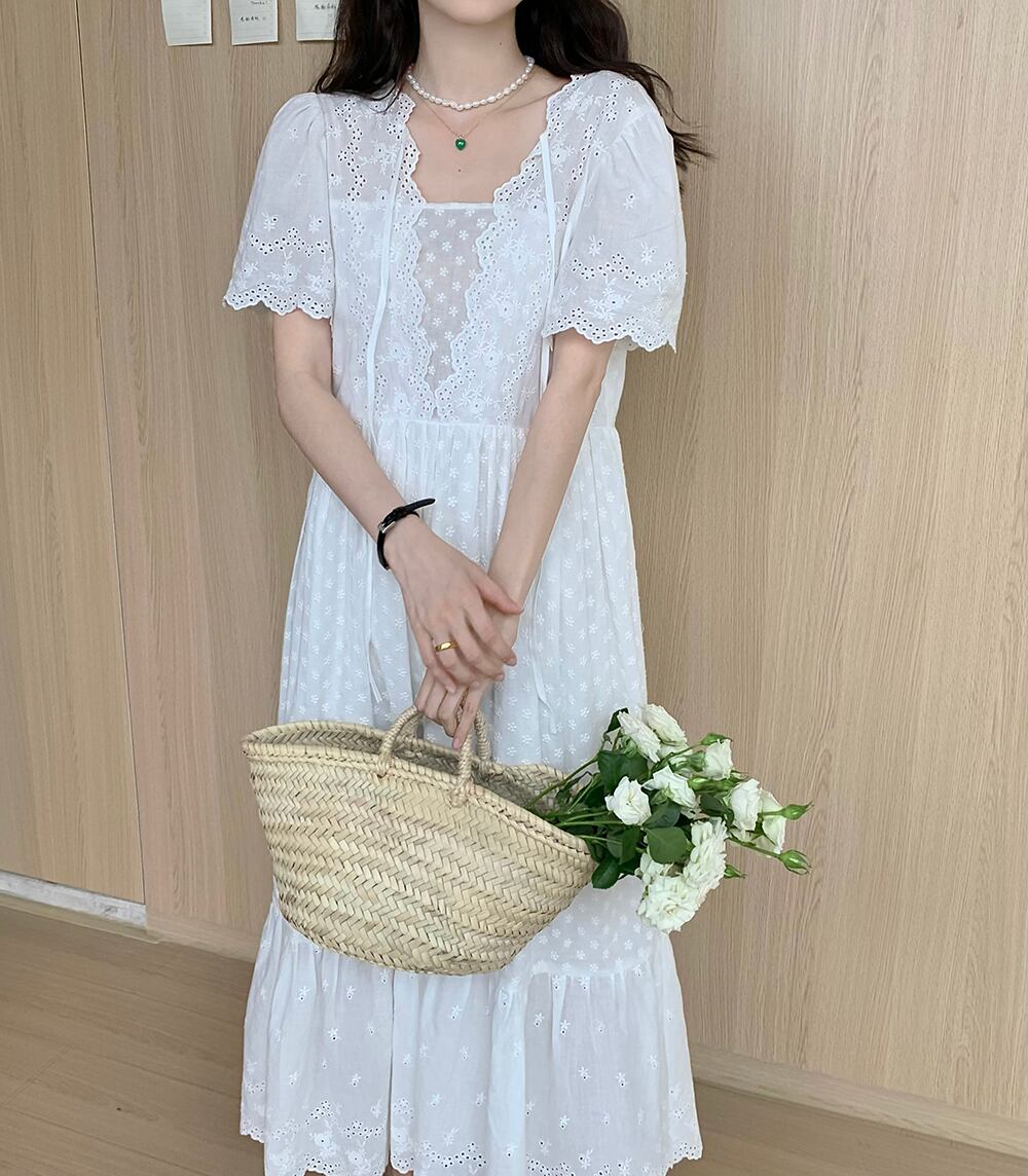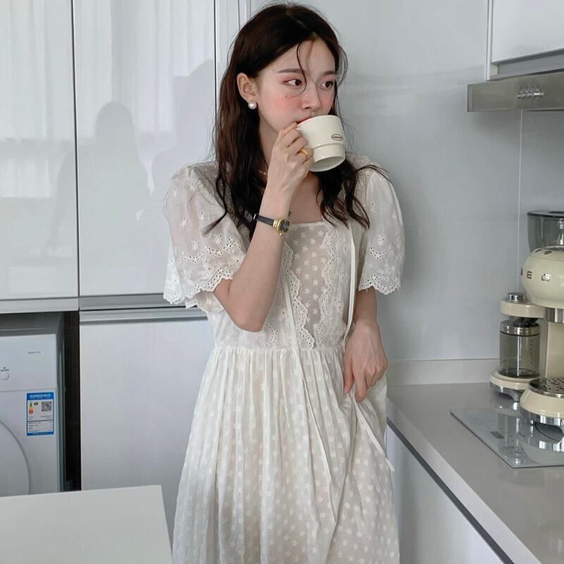 韓国ファッション夏服スタンダードレースカラーハイウェストウェスト半袖スリーブワンピース ショート レッド レトロ ハーフスリーブ 刺繍 大人ガーリー スウィート キュート カジュアル 夏物 フラワーデザイン スクウェア ウエスト muzly95349288228 | Neatly