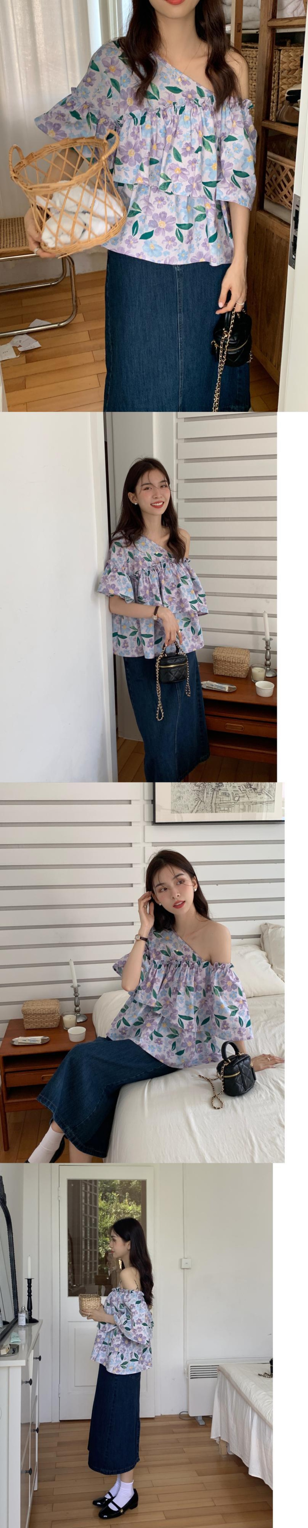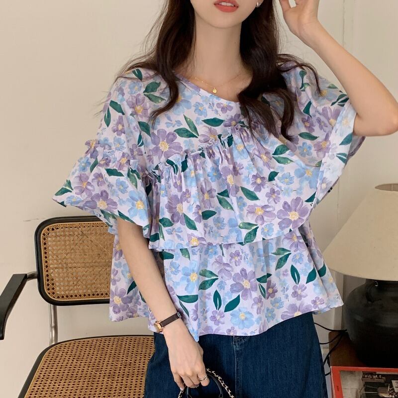 韓国ファッションNEW夏服サイドVネックショートフローラルシャツ レディース 大人ガーリー スウィート キュート カジュアル 夏物 花柄 オフショルダー muzly60808051603 | Neatly