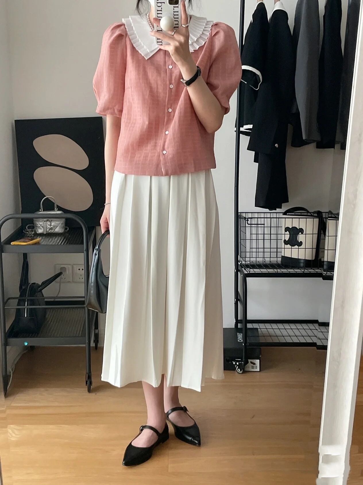 色:ピンクのシャツ,黒いシャツ,アプリコットシャツ,白いスカート