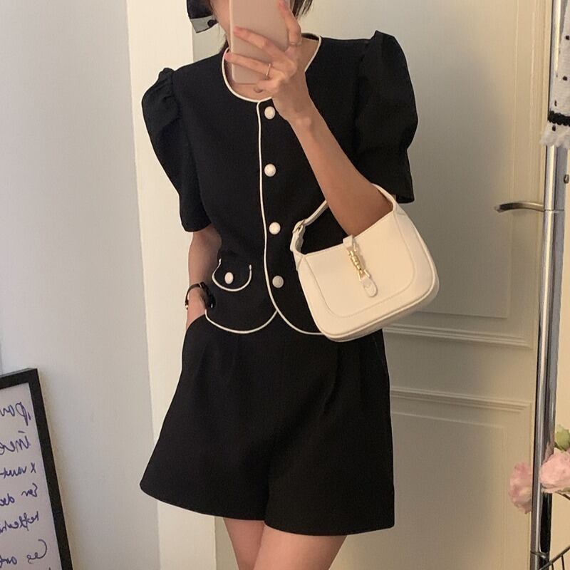韓国ファッションNEW夏服ショートラウンドネック半袖スリーブシャツ ハイウェストウェストワイドレッグパンツ ショーツ レディース ハーフスリーブ 夏物 Oネック ワイドパンツ ウエスト muzly47068043433 | Neatly