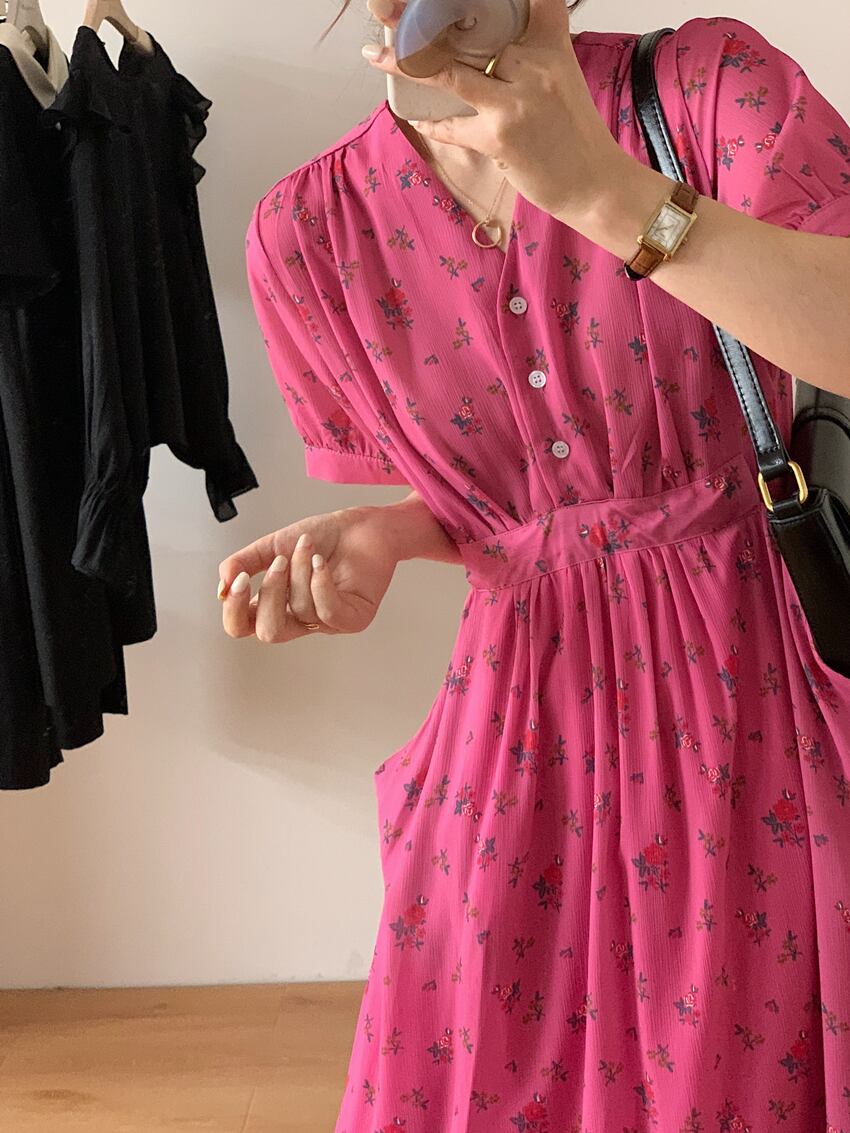韓国ファッションNEW夏服スタンダードVネックフローラルスカート ロングポケットウェストミニ ワンピースワンピースレディース レトロ 大人ガーリー スウィート キュート カジュアル 夏物 花柄 ウエスト muzly11621157729 | Neatly