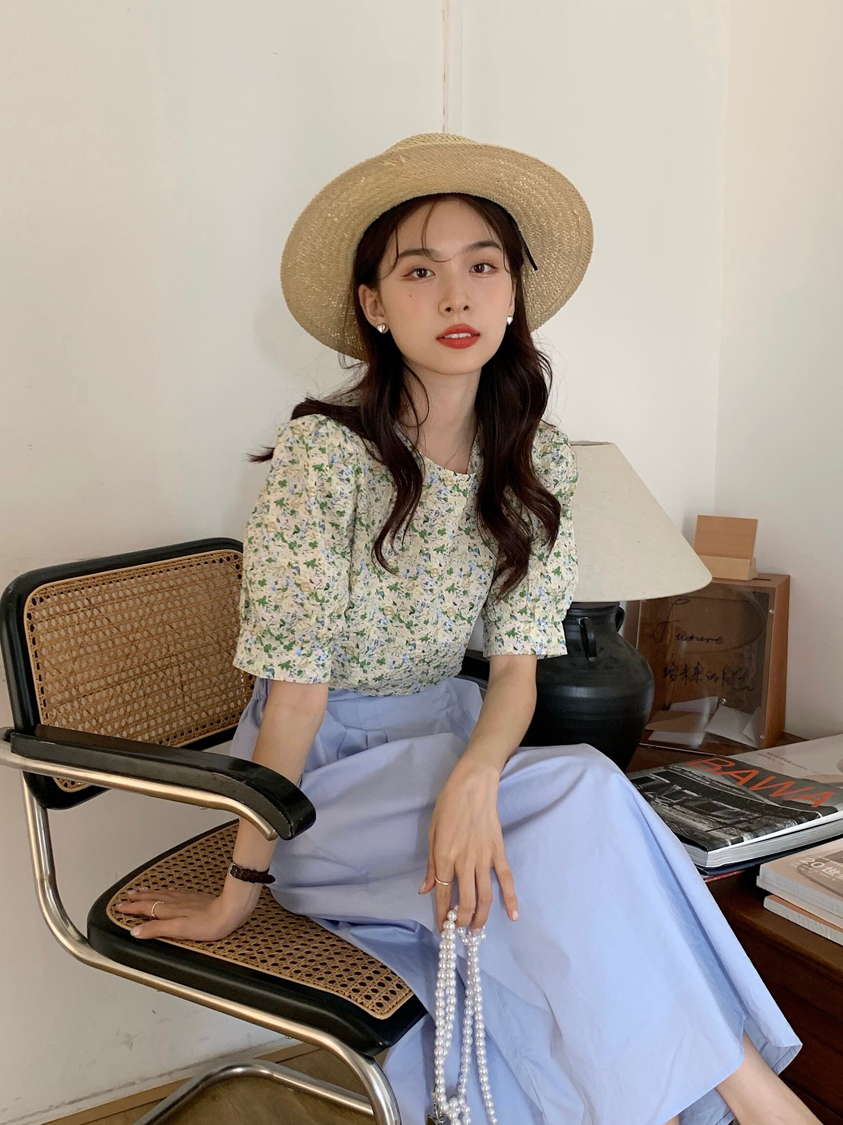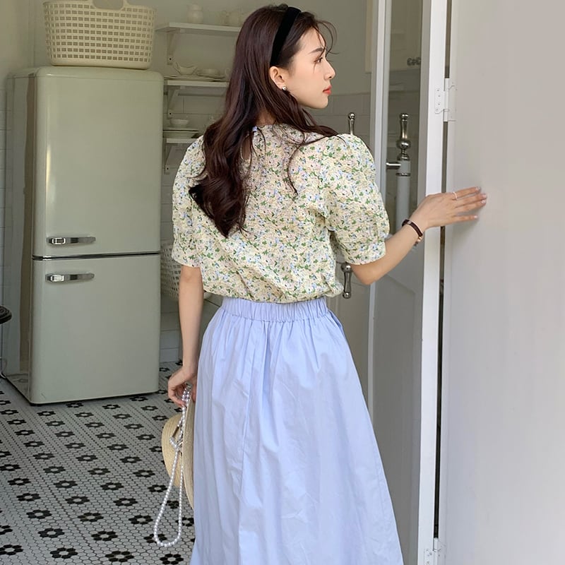 韓国ファッションNEW夏服フローラルラウンドネックシャツ ハイウェストウェストスリムスカート 大人ガーリー スウィート キュート カジュアル 夏物 花柄 Oネック ウエスト ミドル丈 muzly45553209061 | Neatly