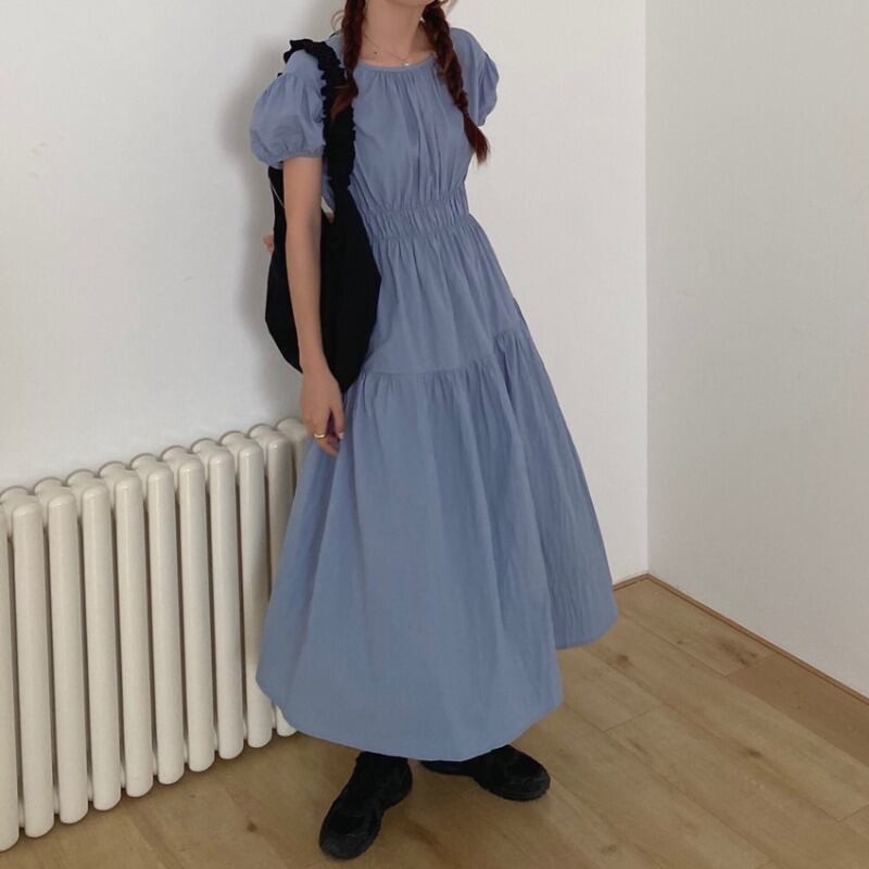 韓国ファッション夏服ラウンドネックソリッド カラーホワイトロングプリーツウェストスリーブワンピースレディース 夏物 Oネック ソリッドカラー ウエスト muzly25112234334 | Neatly