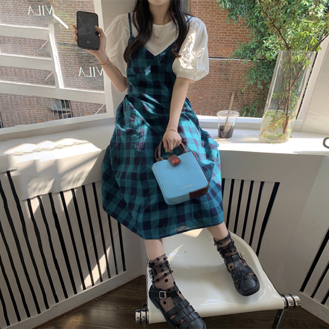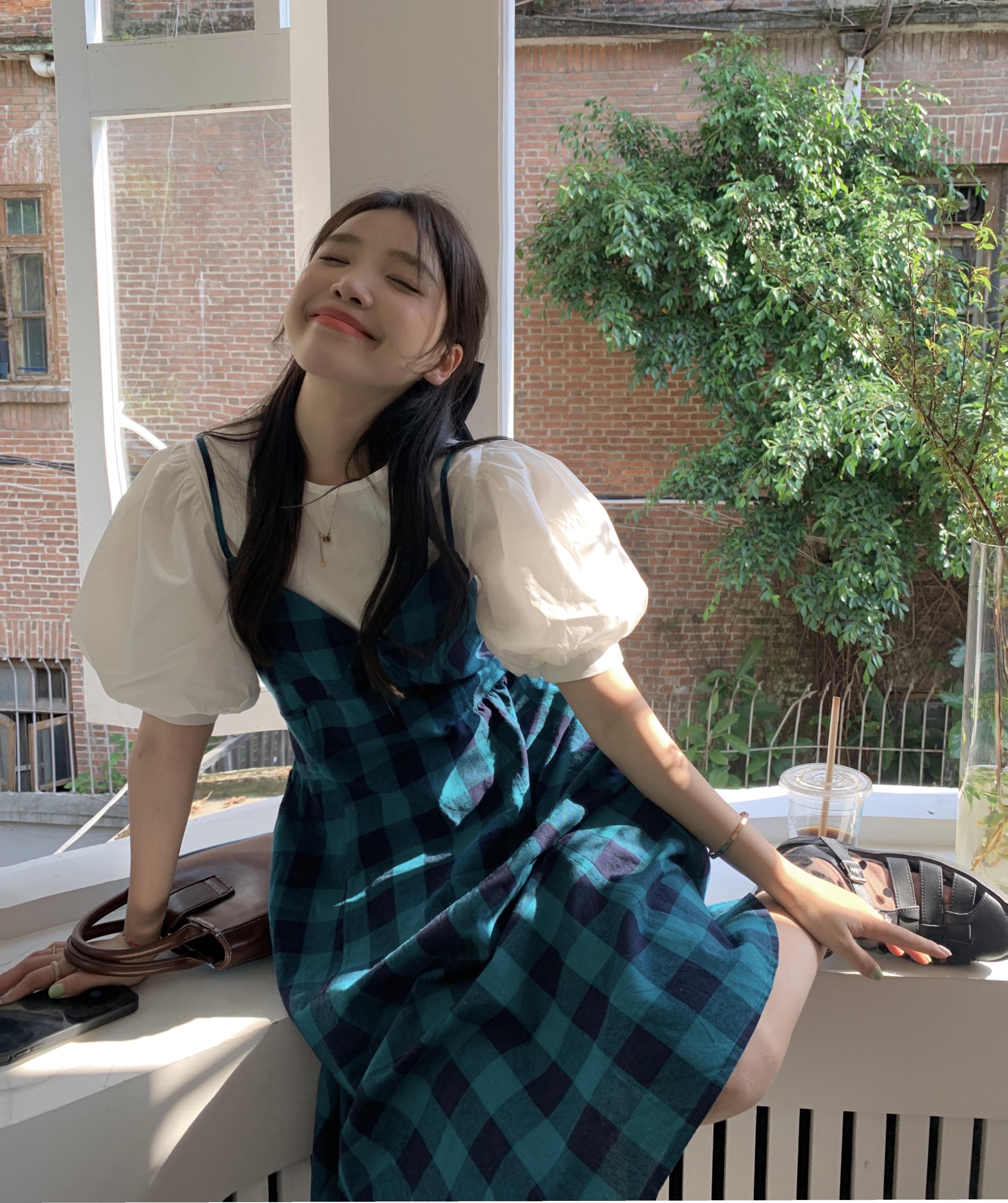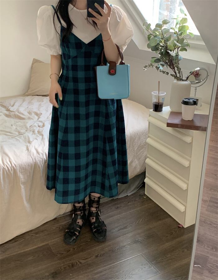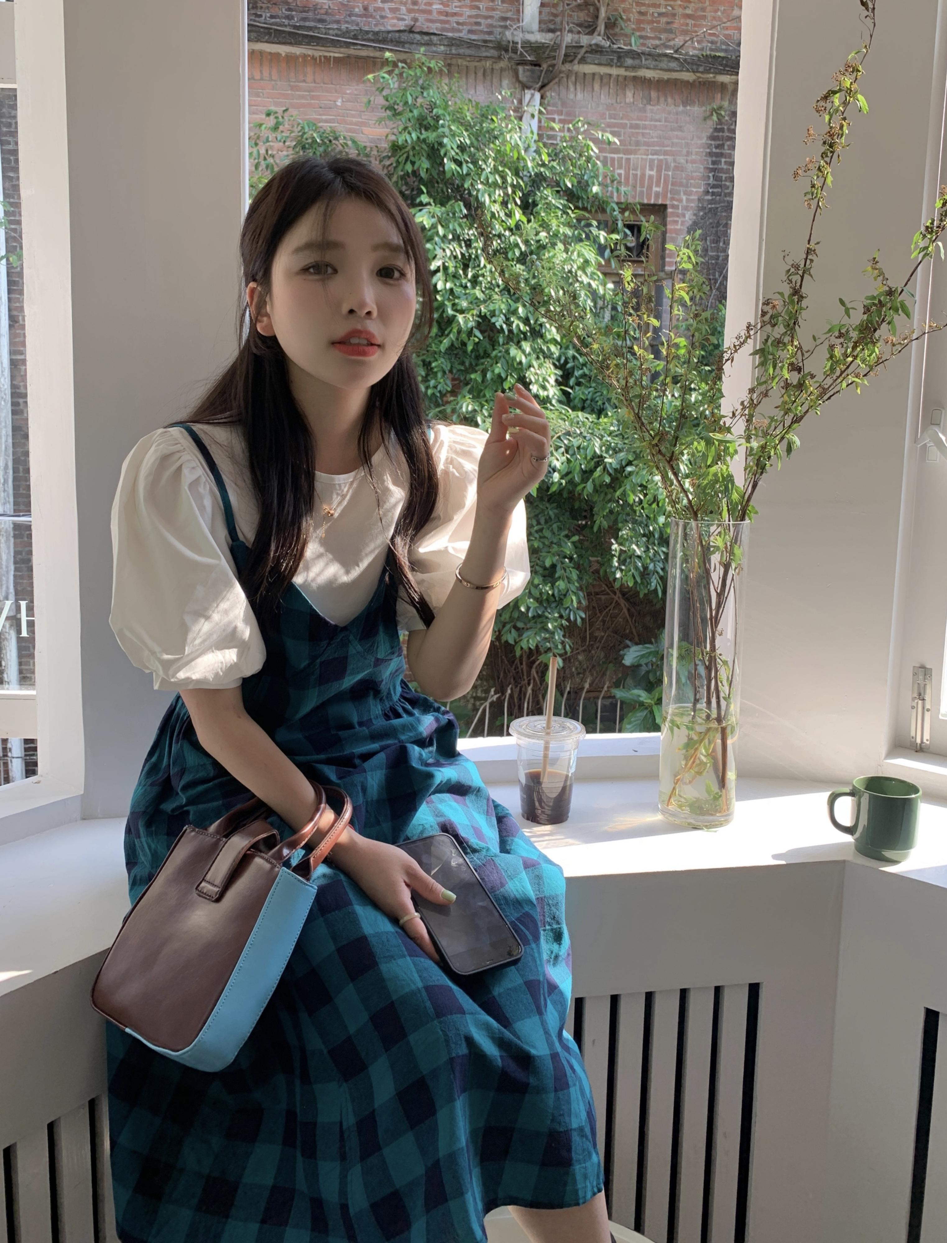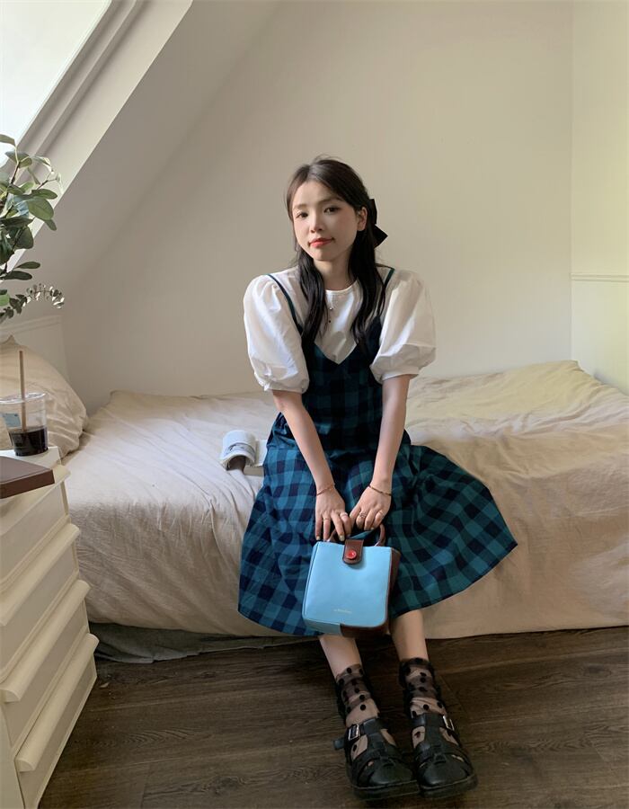 色:シャツ白,ブルーグリッドサスペンダースカート