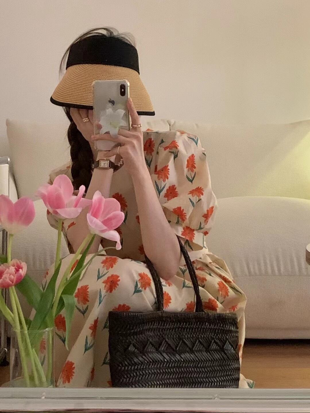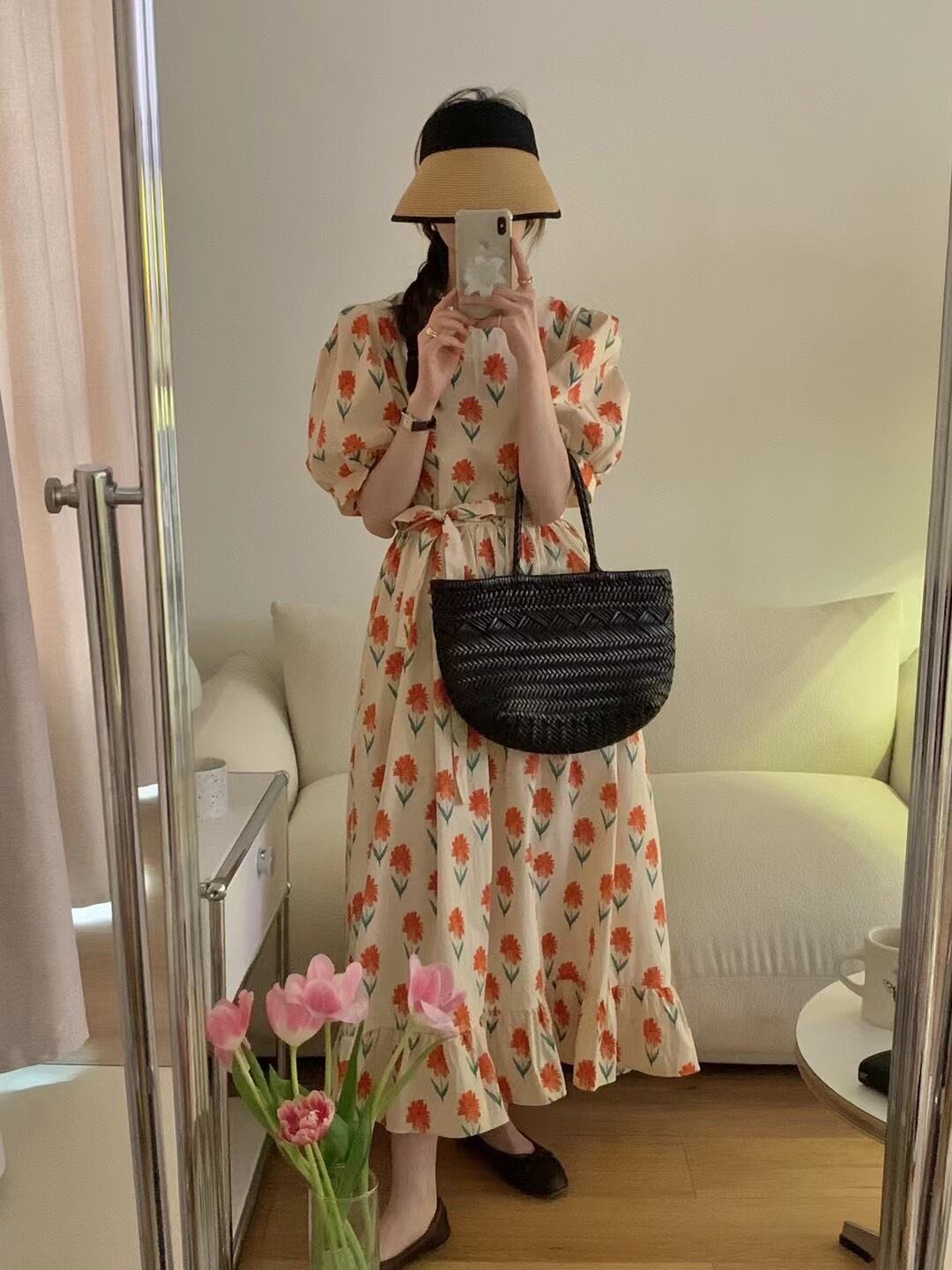 韓国ファッション夏服ロングフローラルスカート ラウンドネックウェストミニ ワンピースワンピースレディース 大人ガーリー スウィート キュート カジュアル 夏物 花柄 Oネック ウエスト muzly47990549882 | Neatly