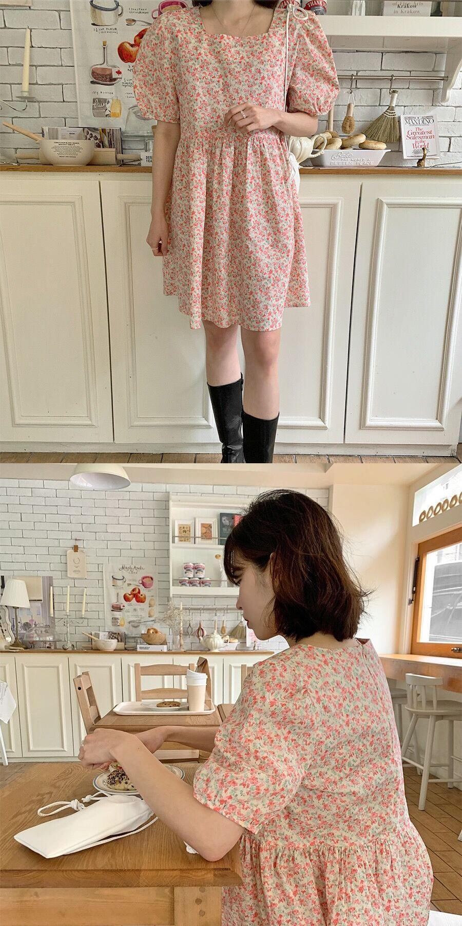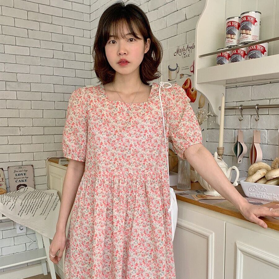 韓国ファッション夏服フローラルスタンダードカラールーズプリーツウェストワンピース レトロ 大人ガーリー スウィート キュート カジュアル 夏物 花柄 スクウェア ウエスト muzly81532549961 | Neatly