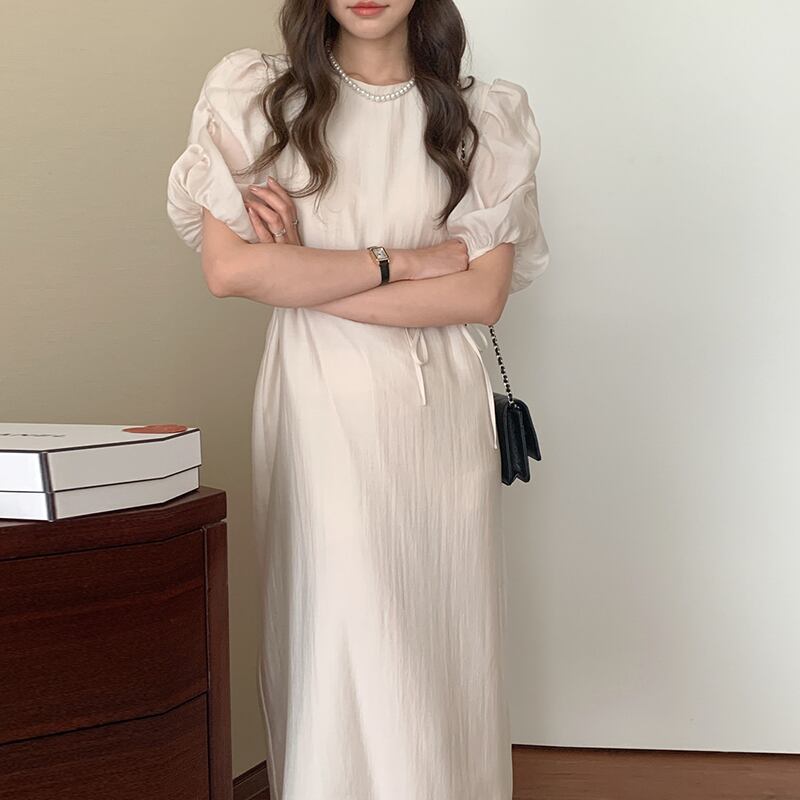 韓国ファッション夏服スタンダードスリーブスリットロングスカート ソリッド カラーラウンドネックミニ ワンピースワンピース レトロ 夏物 Oネック ソリッドカラー muzly10707210340 | Neatly