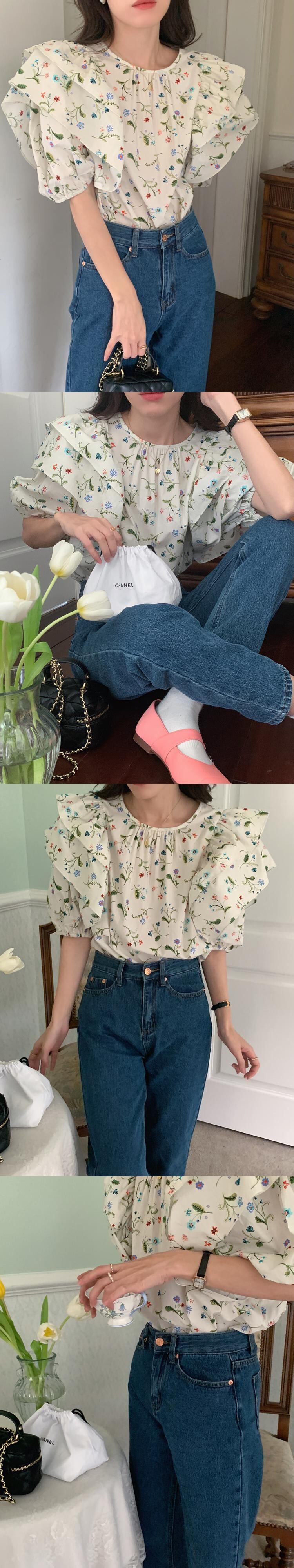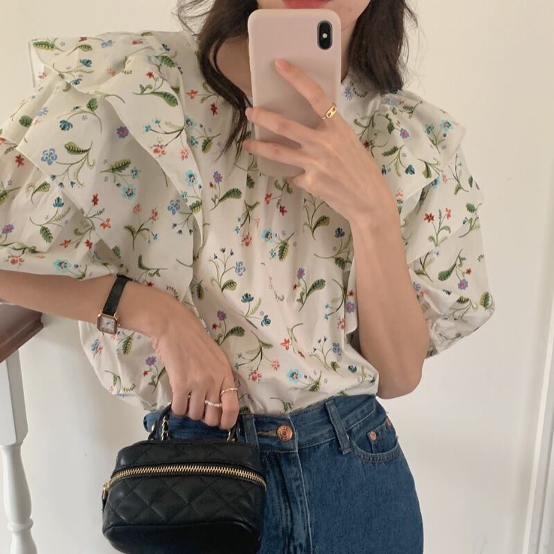 韓国ファッション夏服フローラルトップス プリーツラウンドネックシャツ レディース 大人ガーリー スウィート キュート カジュアル 夏物 花柄 Oネック muzly91198959779 | Neatly