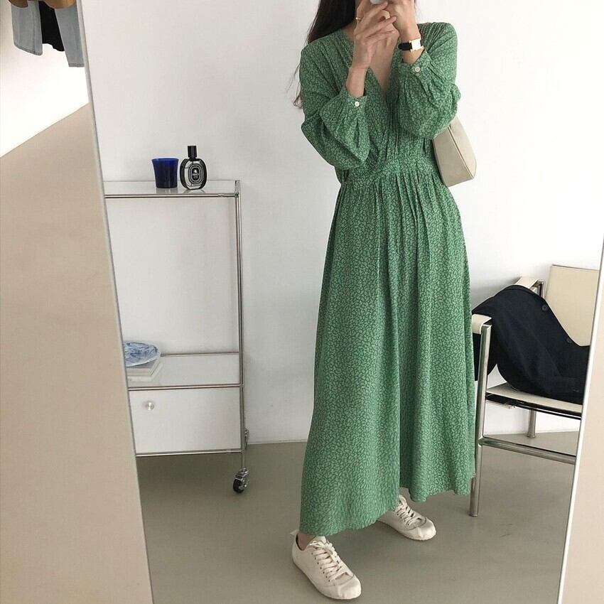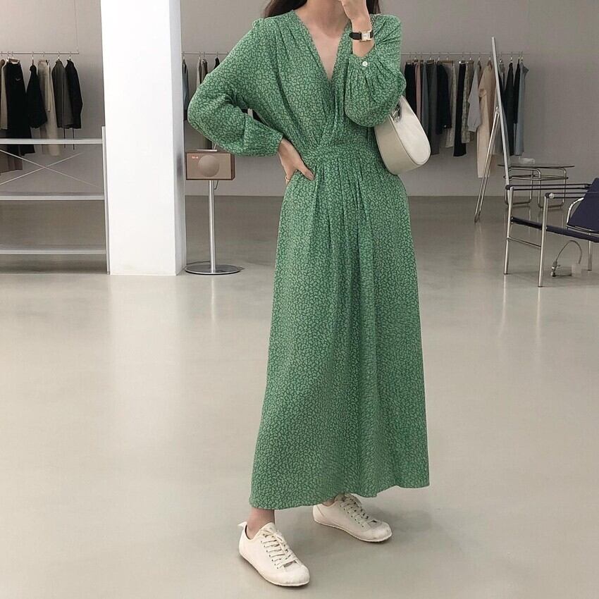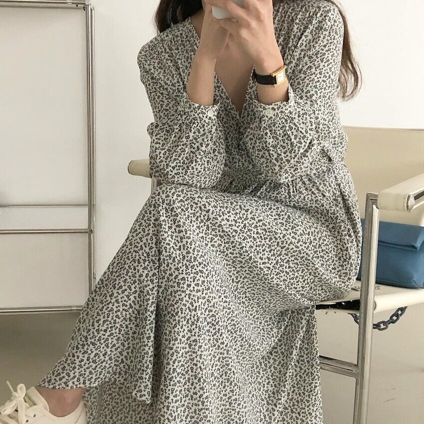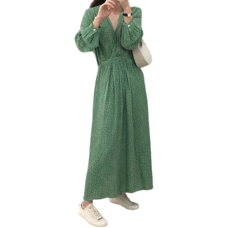 韓国ファッションNEWスプリングスタンダードクロスVネックフローラルロングスカート ウェスト薄手ワンピースレディース レトロ 春物 花柄 長袖 ウエスト muzly28290200597 | Neatly