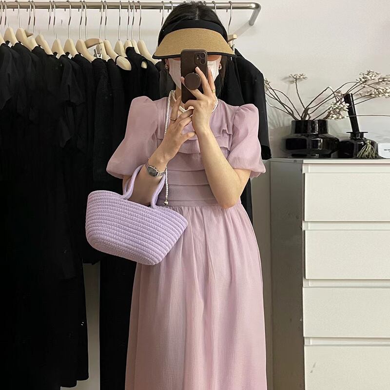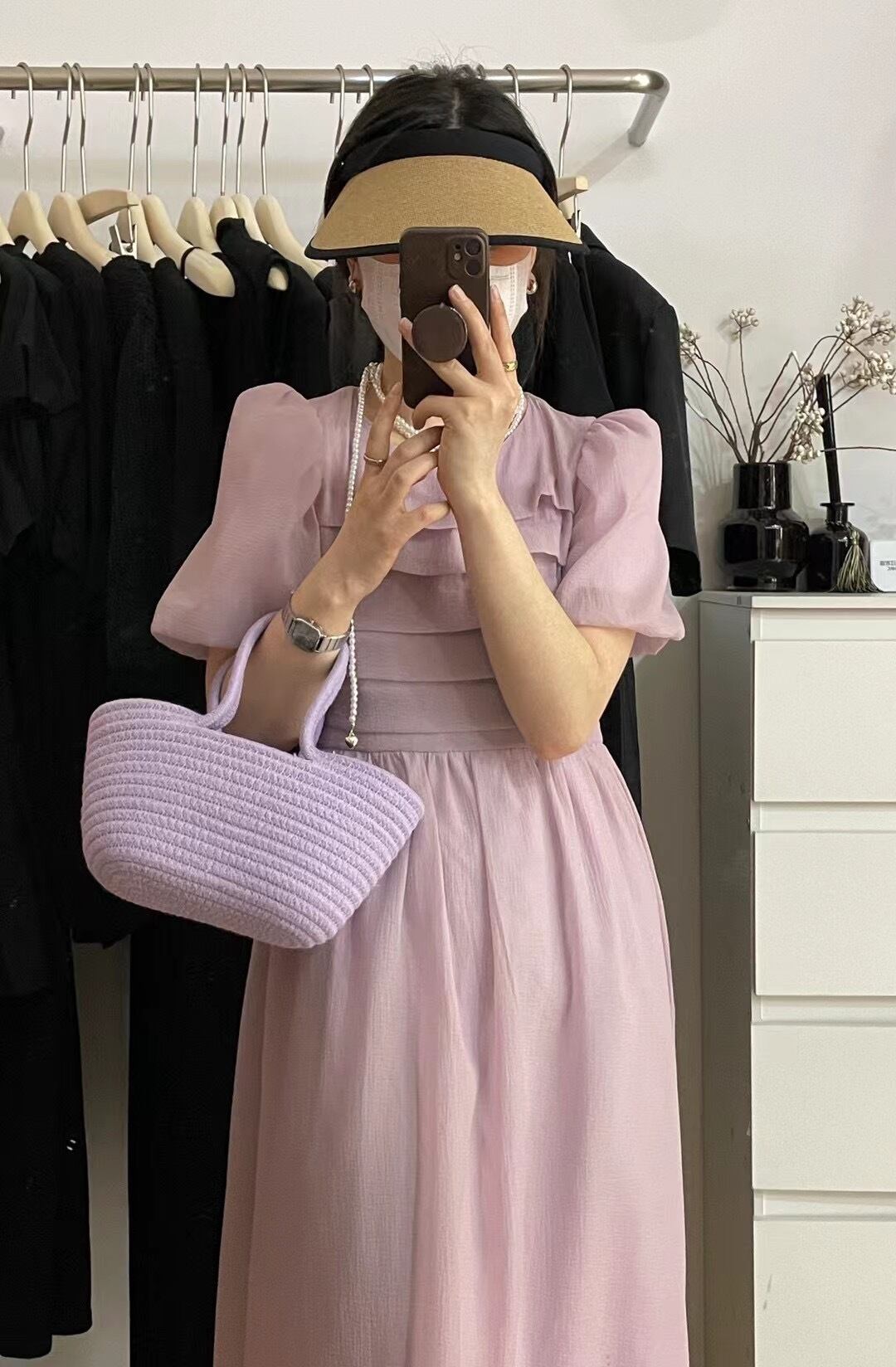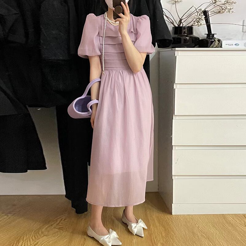 韓国ファッション夏服ラウンドネックスカート プリーツウェストミニ ワンピースワンピースレディース 大人ガーリー スウィート キュート カジュアル 夏物 Oネック ウエスト ミドル丈 muzly91094311007 | Neatly