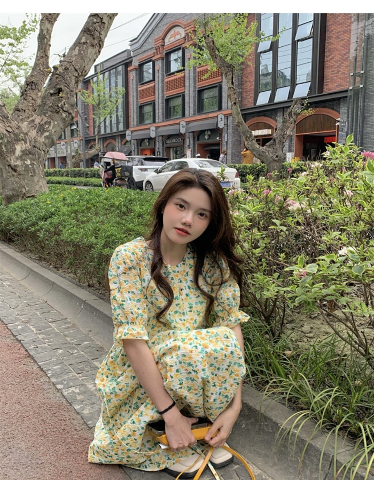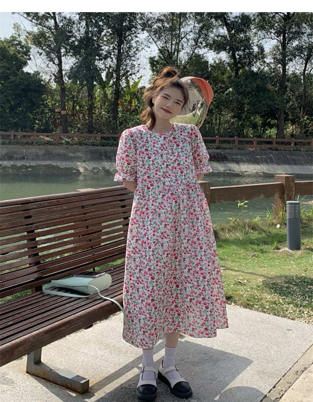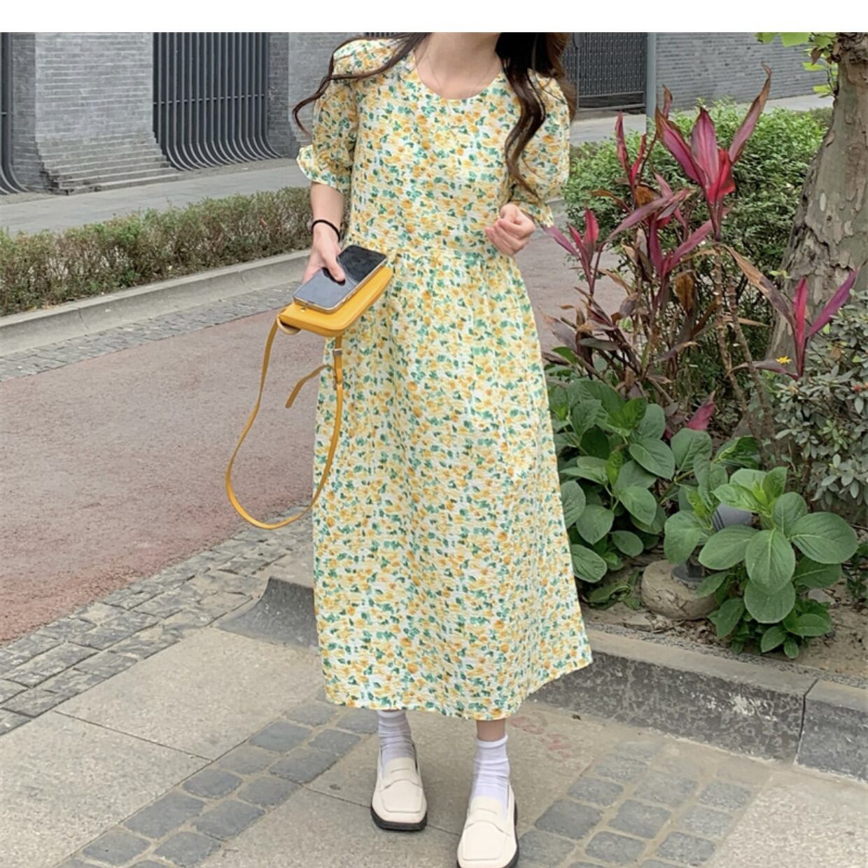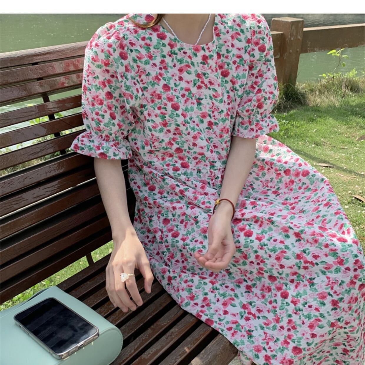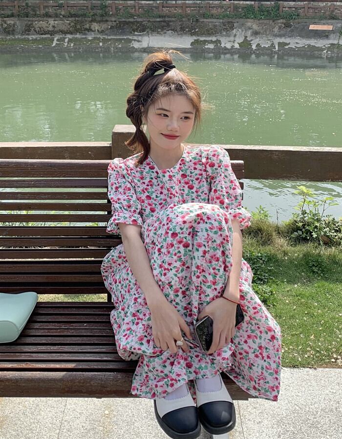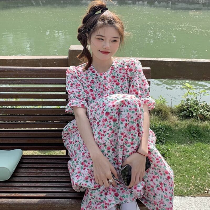 韓国ファッション夏服ラウンドネックフローラルスカート ルーズウェストスリーブワンピース 大人ガーリー スウィート キュート カジュアル 夏物 花柄 Oネック ウエスト ミドル丈 muzly17734843117 | Neatly