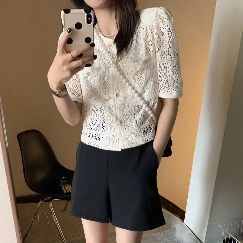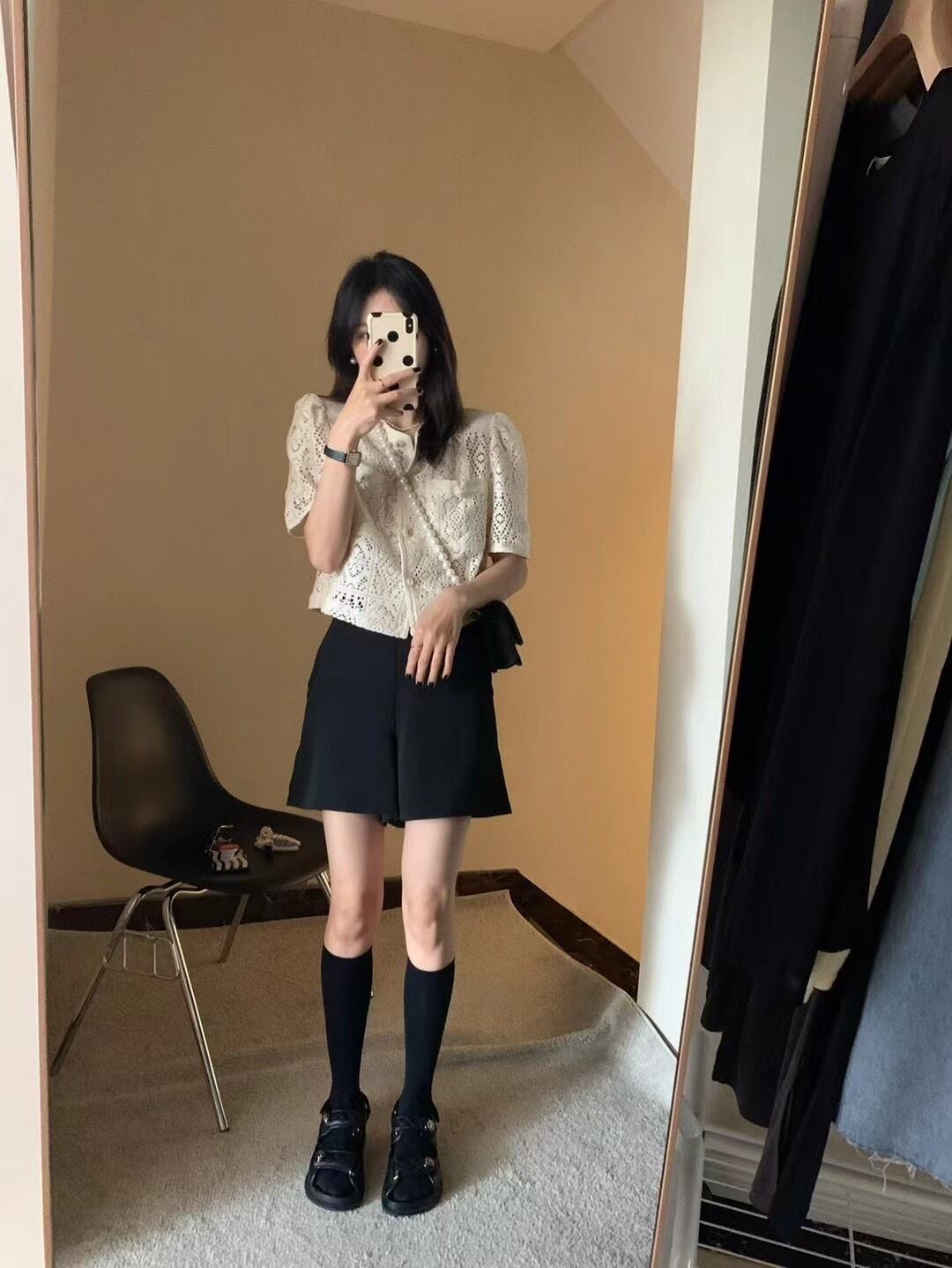 韓国ファッションNEW夏服ラウンドネックレースシャツ 半袖スリーブハイウェストウェストカジュアルワイドレッグパンツ ショーツ ショート ハーフスリーブ 夏物 Oネック ワイドパンツ ウエスト muzly99594449329 | Neatly