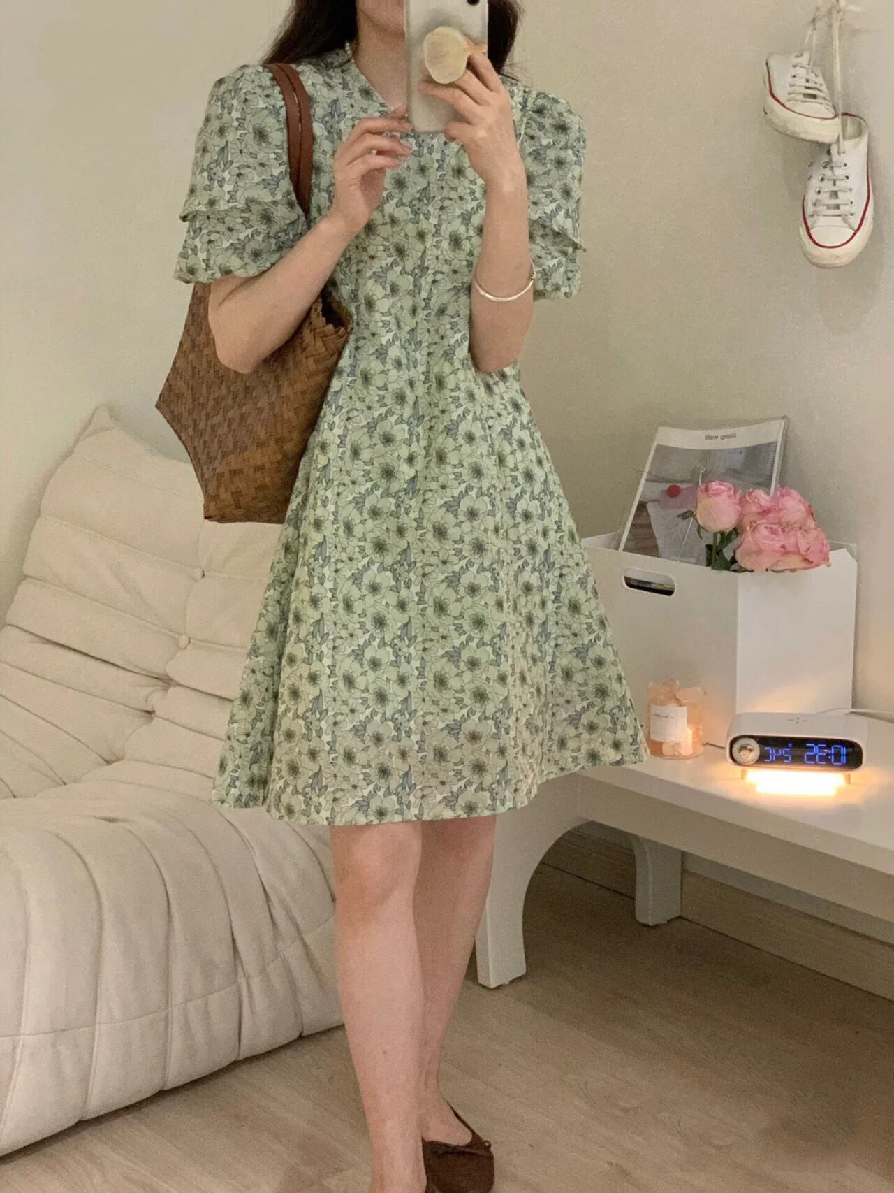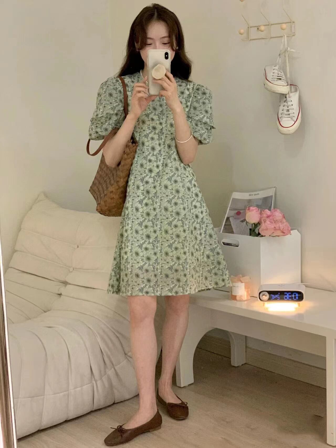 韓国ファッション夏服スタンダードラウンドネックフローラルショートスカート スリムフィット薄手ミニ ワンピースワンピースレディース レトロ 夏物 花柄 Oネック muzly79045870633 | Neatly