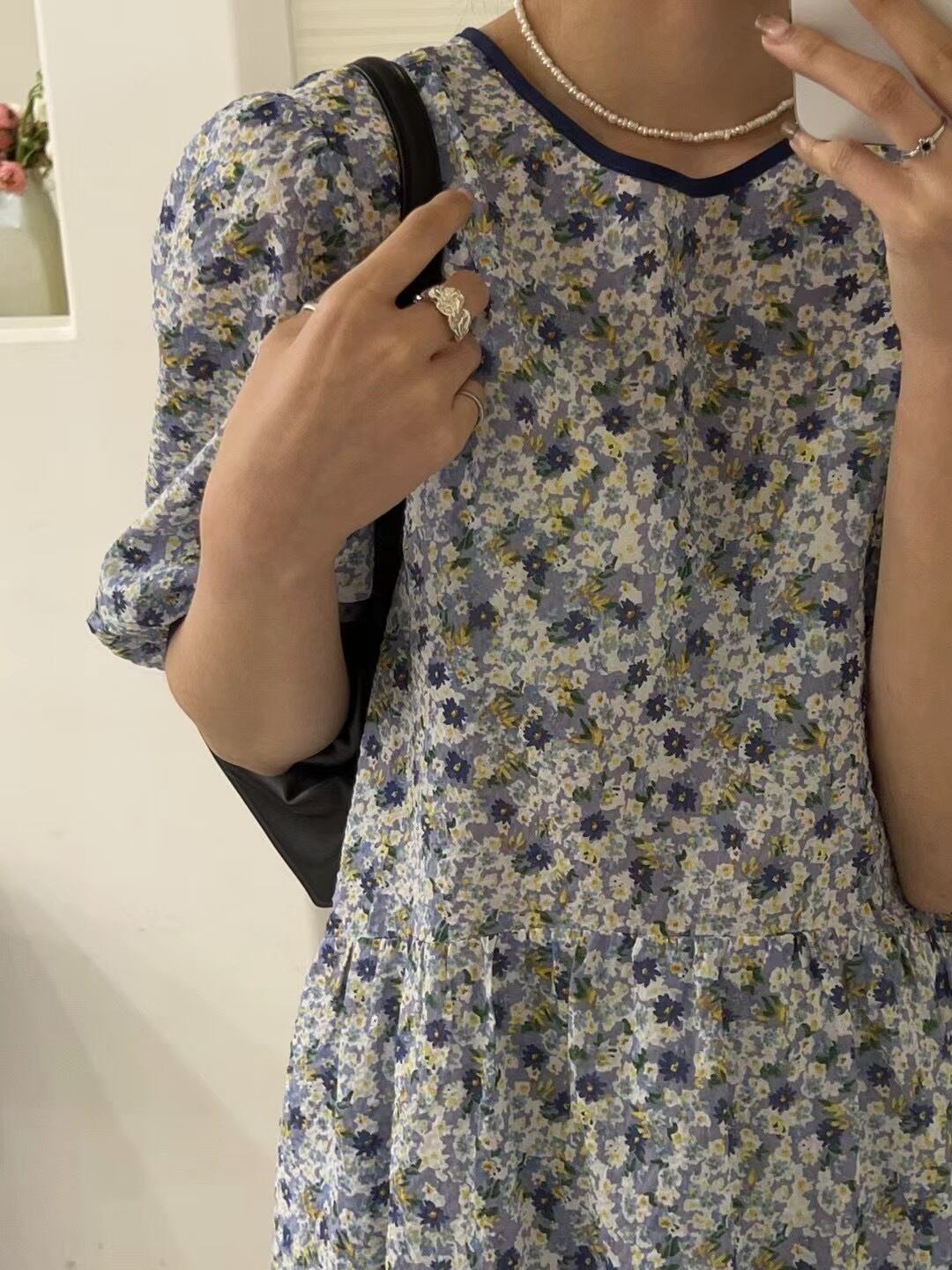 韓国ファッション夏服スタンダードラウンドネックフローラルスカート ロングウェスト薄手半袖スリーブワンピースレディース ショート レトロ ハーフスリーブ 夏物 花柄 Oネック ウエスト muzly89455928941 | Neatly