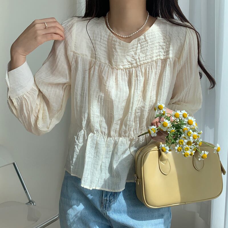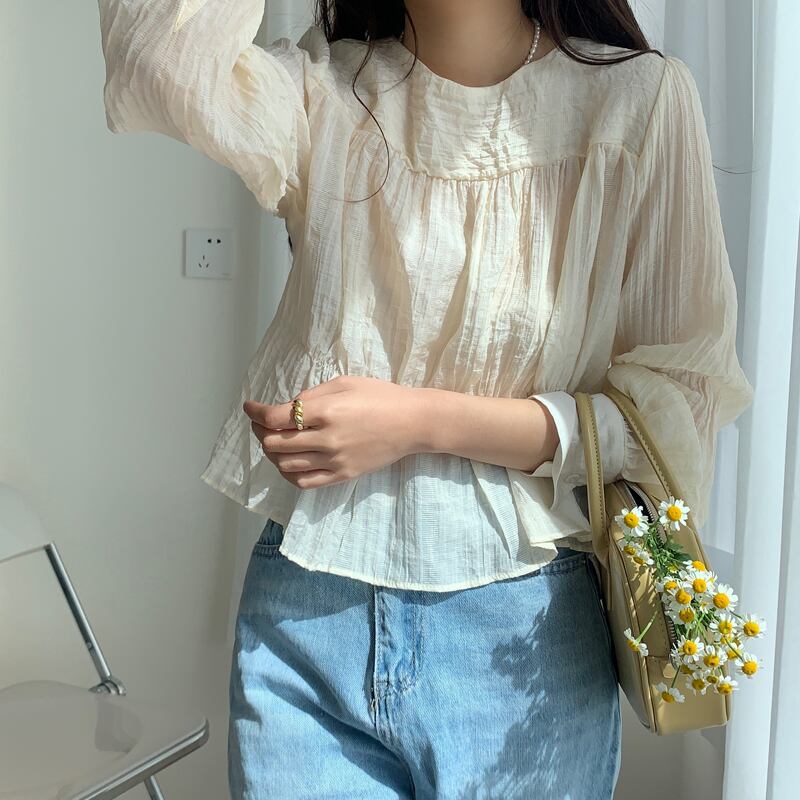 韓国ファッションスプリングラウンドネックトップス ルーズ薄手シャツ レディース ロング 大人ガーリー スウィート キュート カジュアル 春物 Oネック 長袖 muzly7059904006 | Neatly