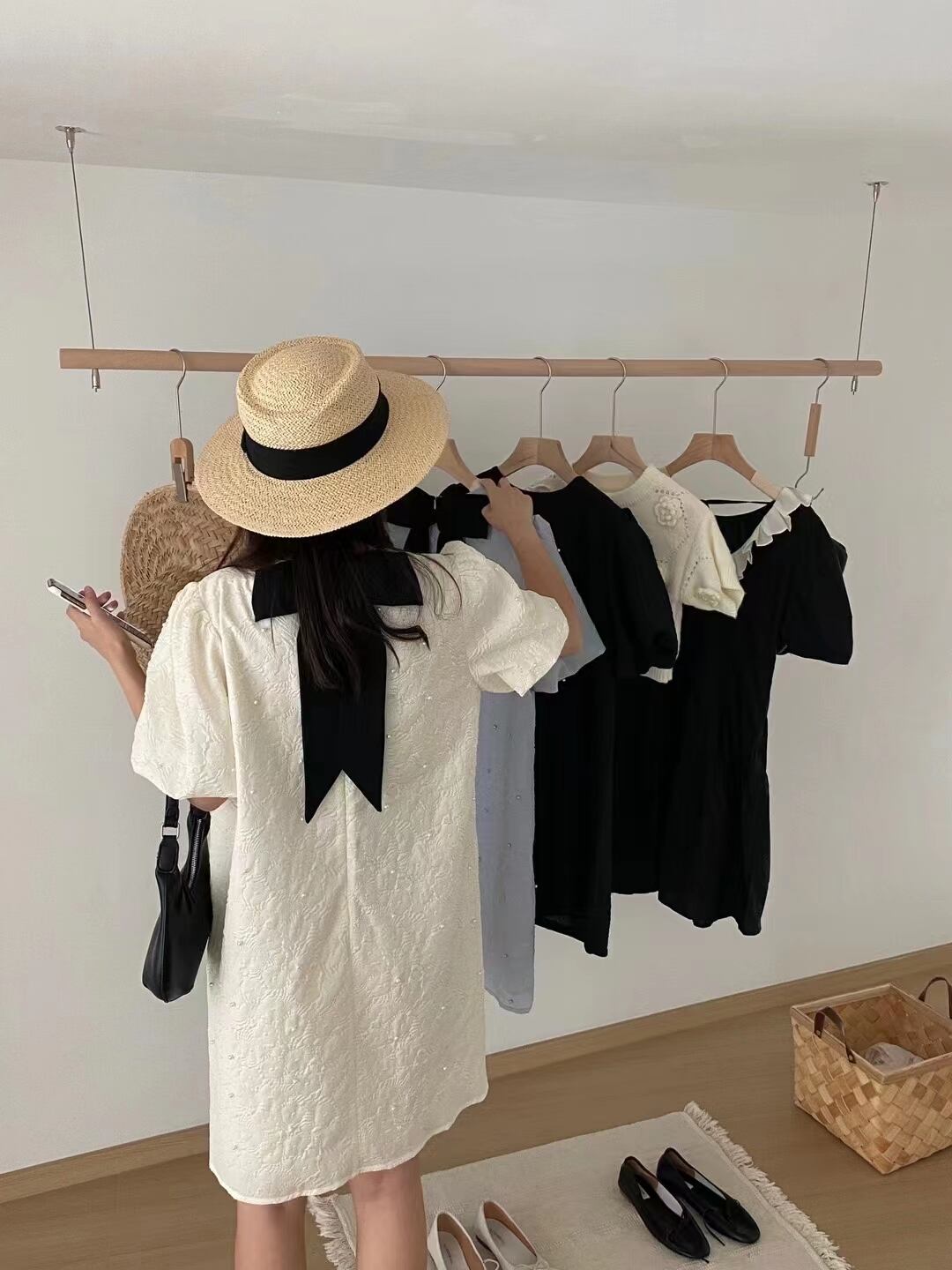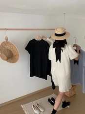 韓国ファッション夏服ラウンドネックリボンルーズジャカードショートスカート 薄手ミニ ワンピースワンピース 大人ガーリー スウィート キュート カジュアル 夏物 Oネック muzly63627645520 | Neatly
