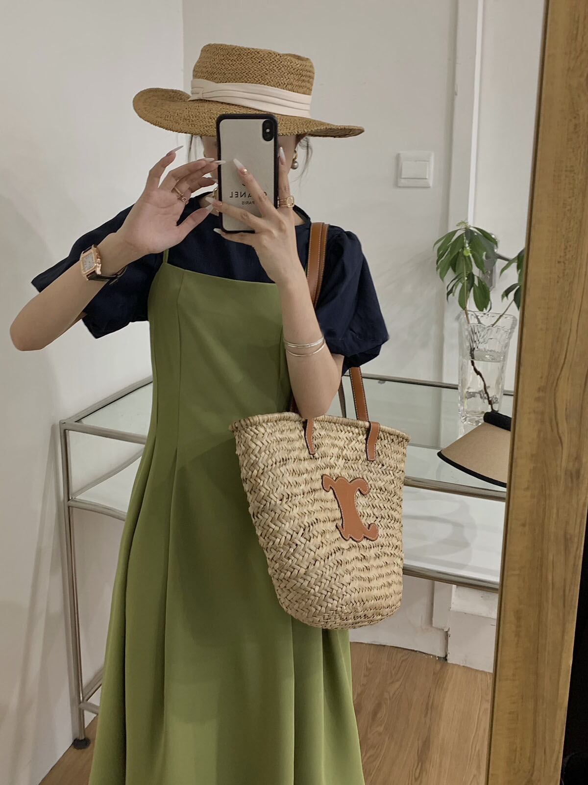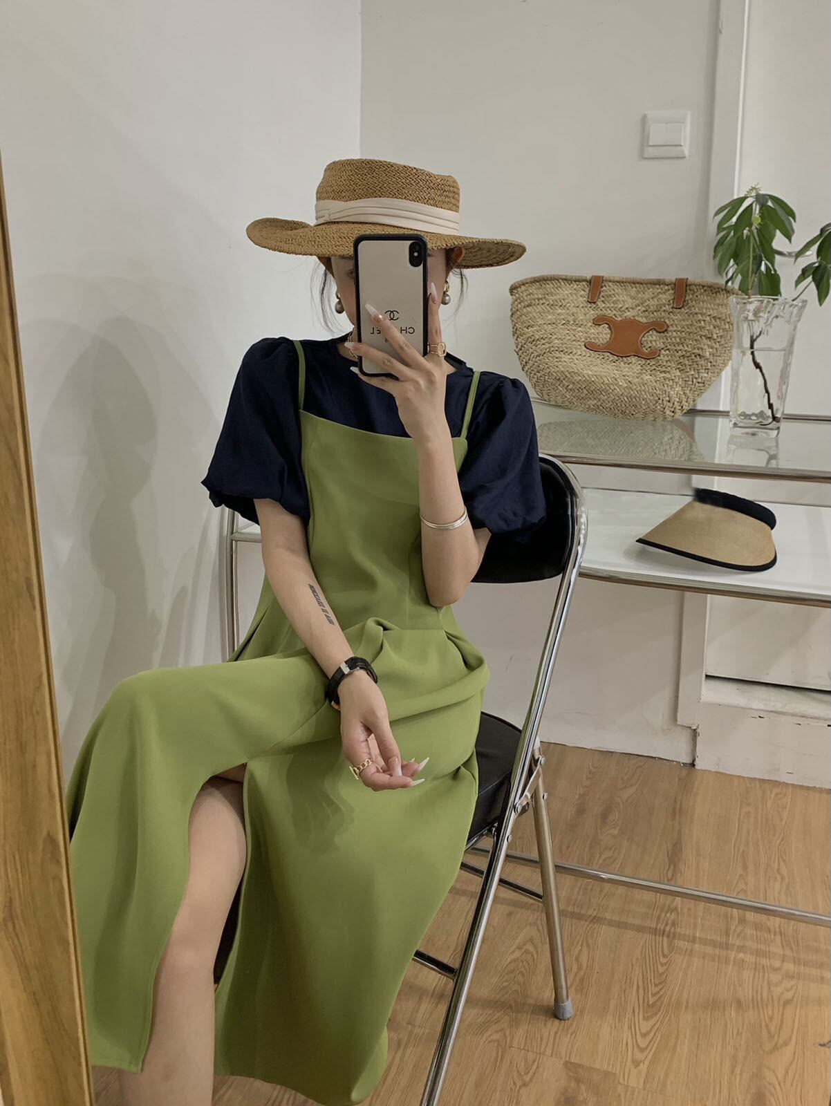 色:ネイビーブルーのシャツ,白のシャツ,ブラックキャミソール,緑のサスペンダースカート
